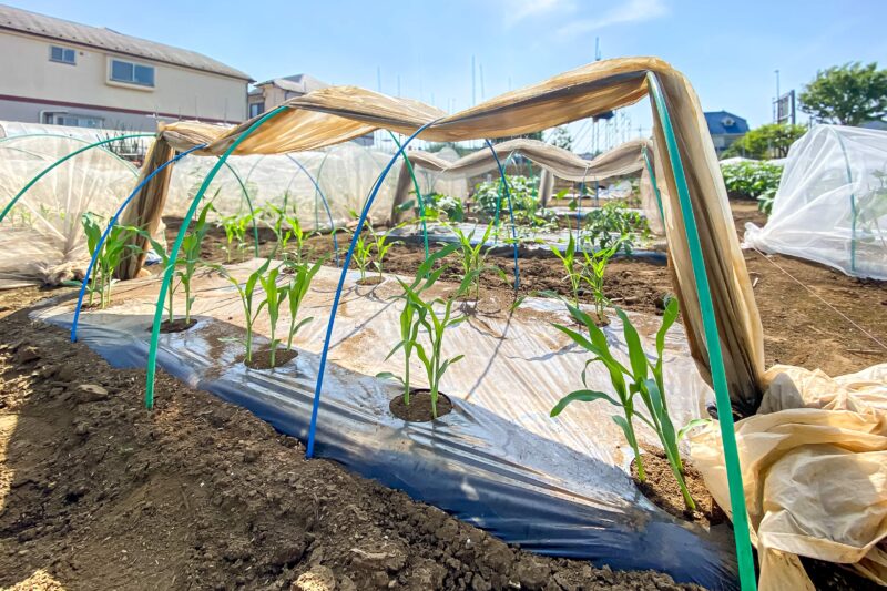 こちらは数週間前に蒔いたトウモロコシ。1穴につき3粒蒔きしている関係上全ての穴から3つの芽が出ていますが、そろそろこれらは間引き作業を行い、最終的には1穴1本にします。ただ現段階で一気に間引いてしまうのは少々リスキーなので、今日から天気の良い日はこのようにビニールトンネルを開けっぱなしにし風当たりを良くします。