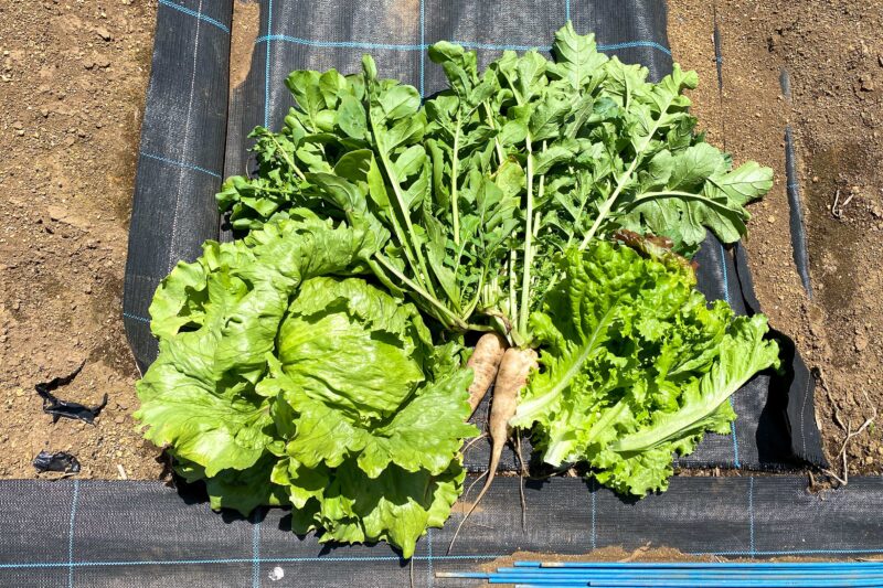この日の収穫はこちら。玉レタス、リーフレタス、ルッコラ、大根(間引き分)。
