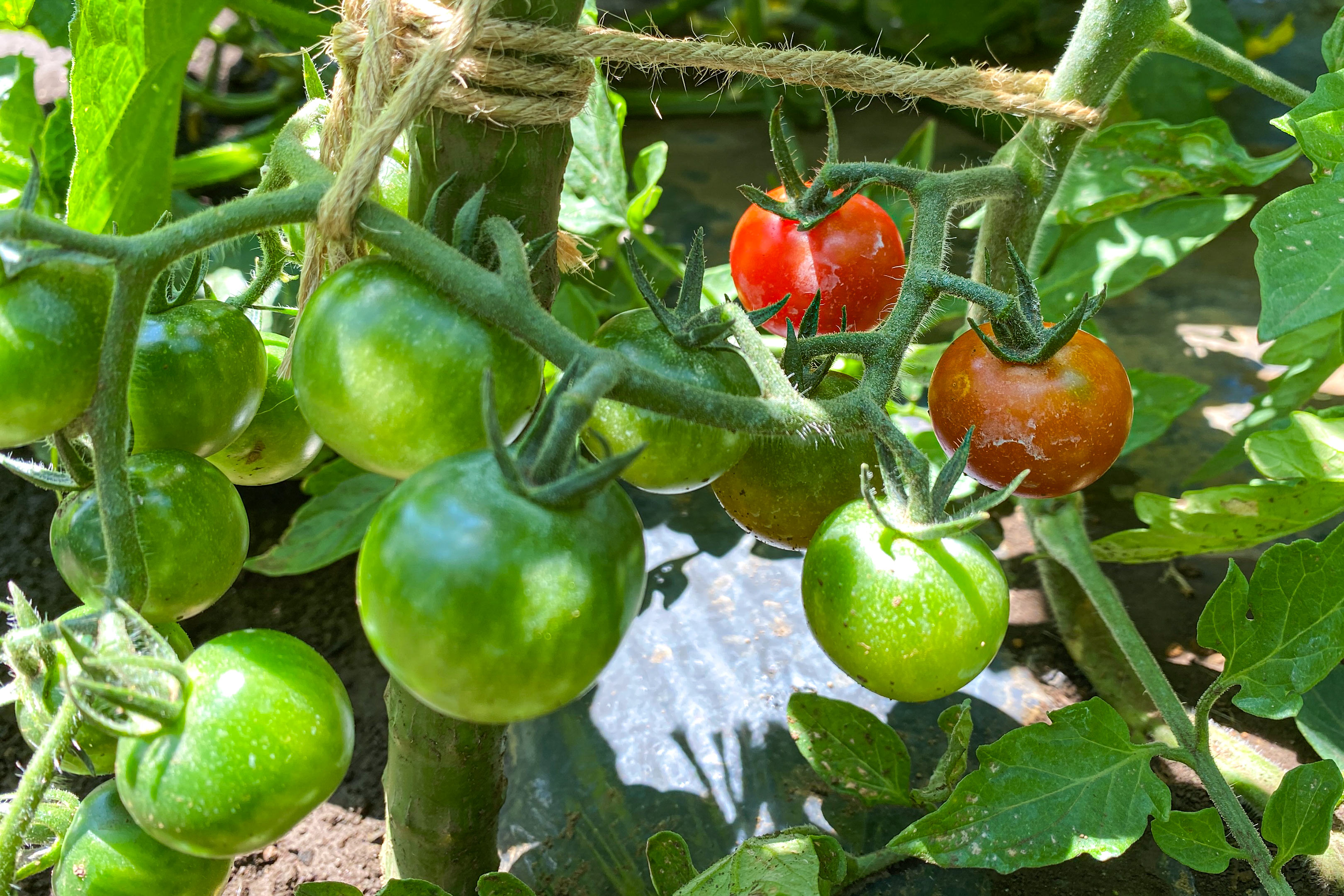 我が家のトマトは昨年同様、大玉、中玉、ミニの3種類が順調に成長しています。中でも一番早く収穫が始まるミニサイズはご覧の通り第一果房が色づいてきました。ここまで来ると次々赤く染まってきて畑が華やかになるんですよね。