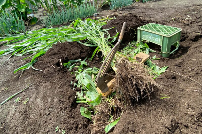 我が家(東京)の体験農園でも区画の一部には緑肥を植えており、春から夏にかけてこのエリアだけは作物を作らず緑肥だけを育ててきました。それがもう人の背丈を超える高さにまで成長したためここで土の中にすき込みます。