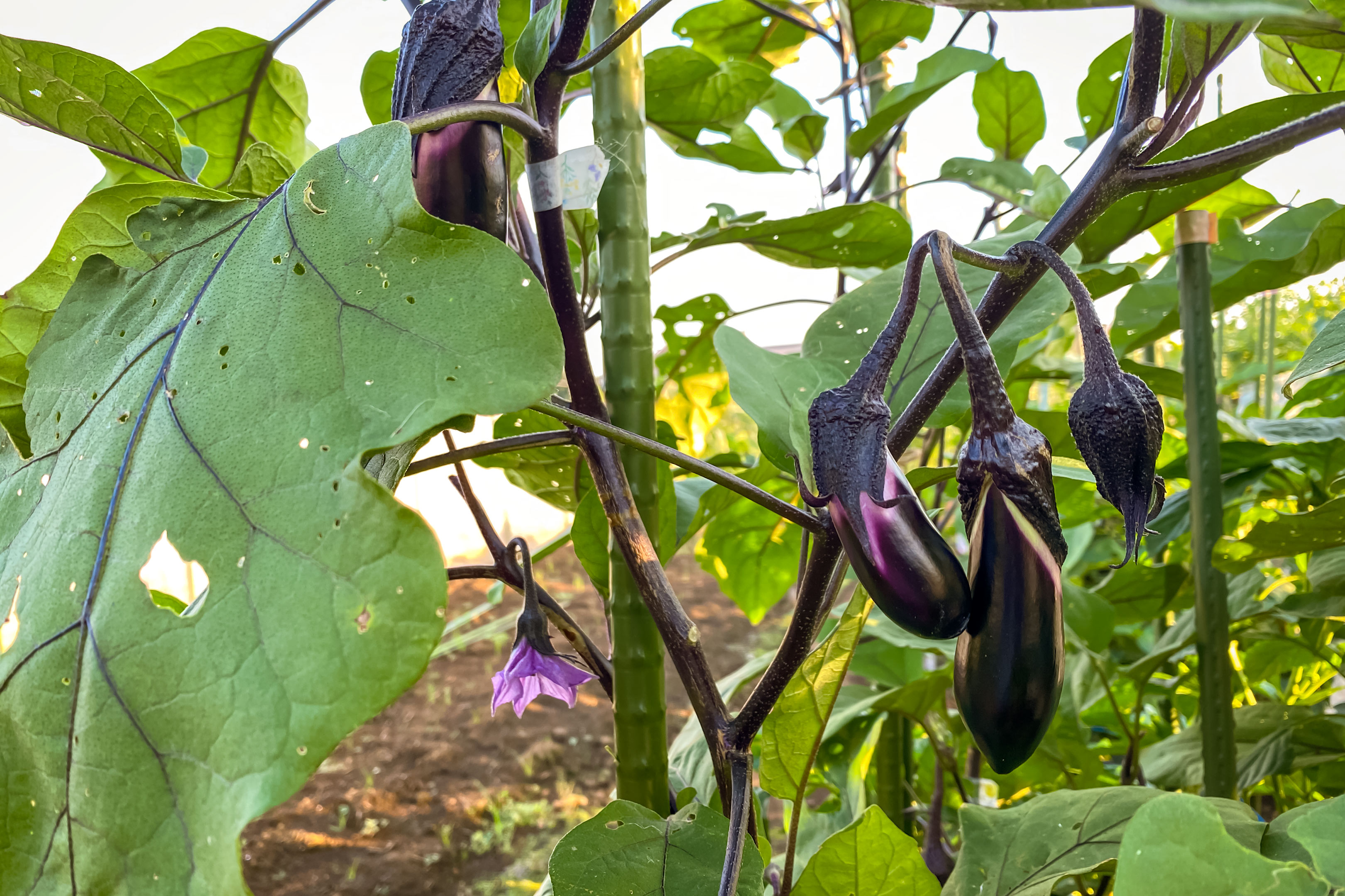 手入れをしていてすぐに気がつく昨年との違いは、上の写真にあるように1箇所から3本の実が成ってしまっているところ。普通は1箇所1本の実がつくものですからね。1番花が咲いた直後からこうした変化は気になっていたのですが、その後も1本のナスの木のあちこちにこうしたものが見受けられ、先生に聞けばこれは生理障害だろうとのこと。ナスを育てているとよくあることのようですが、本来1本のところに3本同時に実がなってしまうため成長が著しく遅くなっているのではないかと。