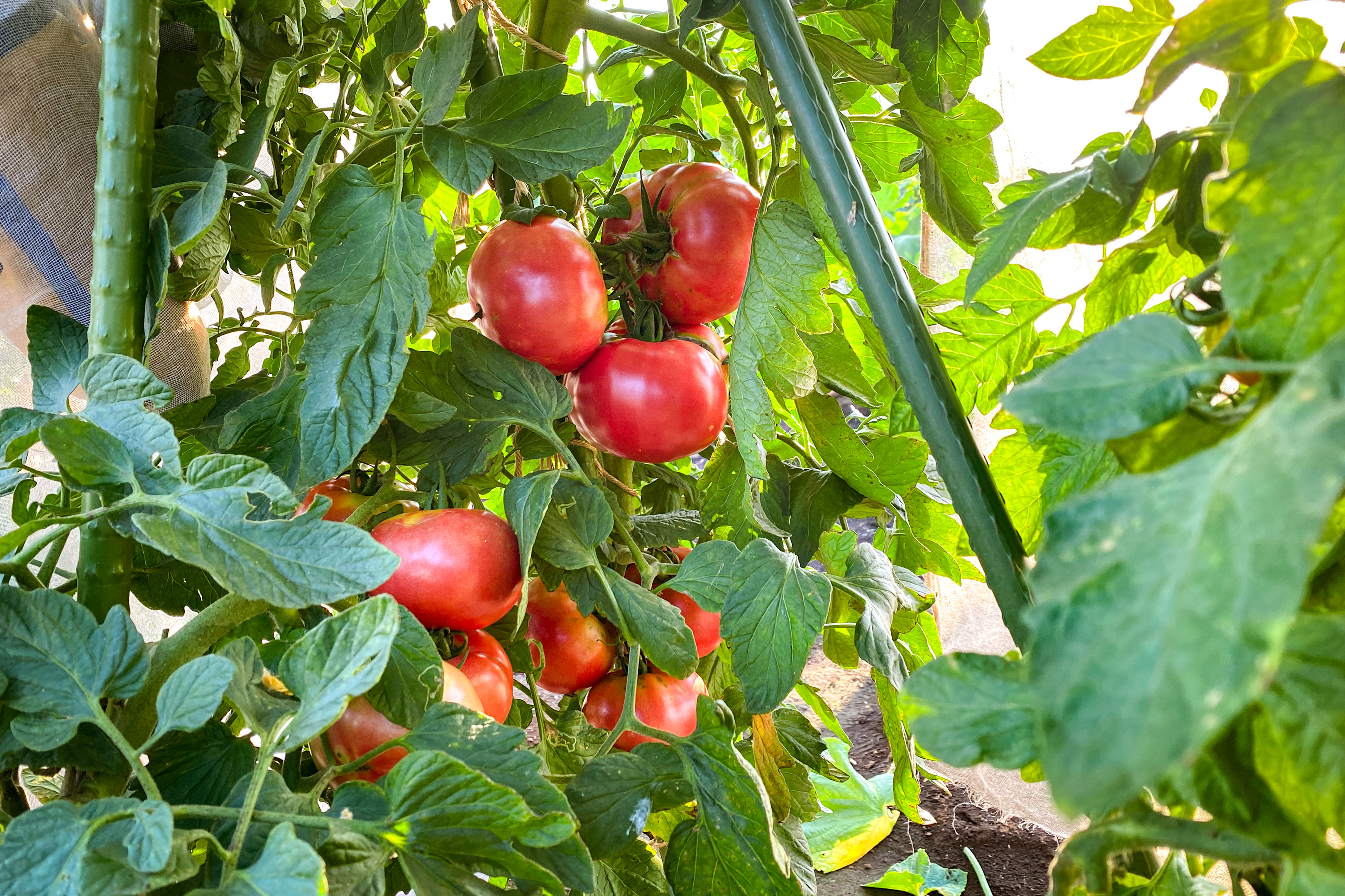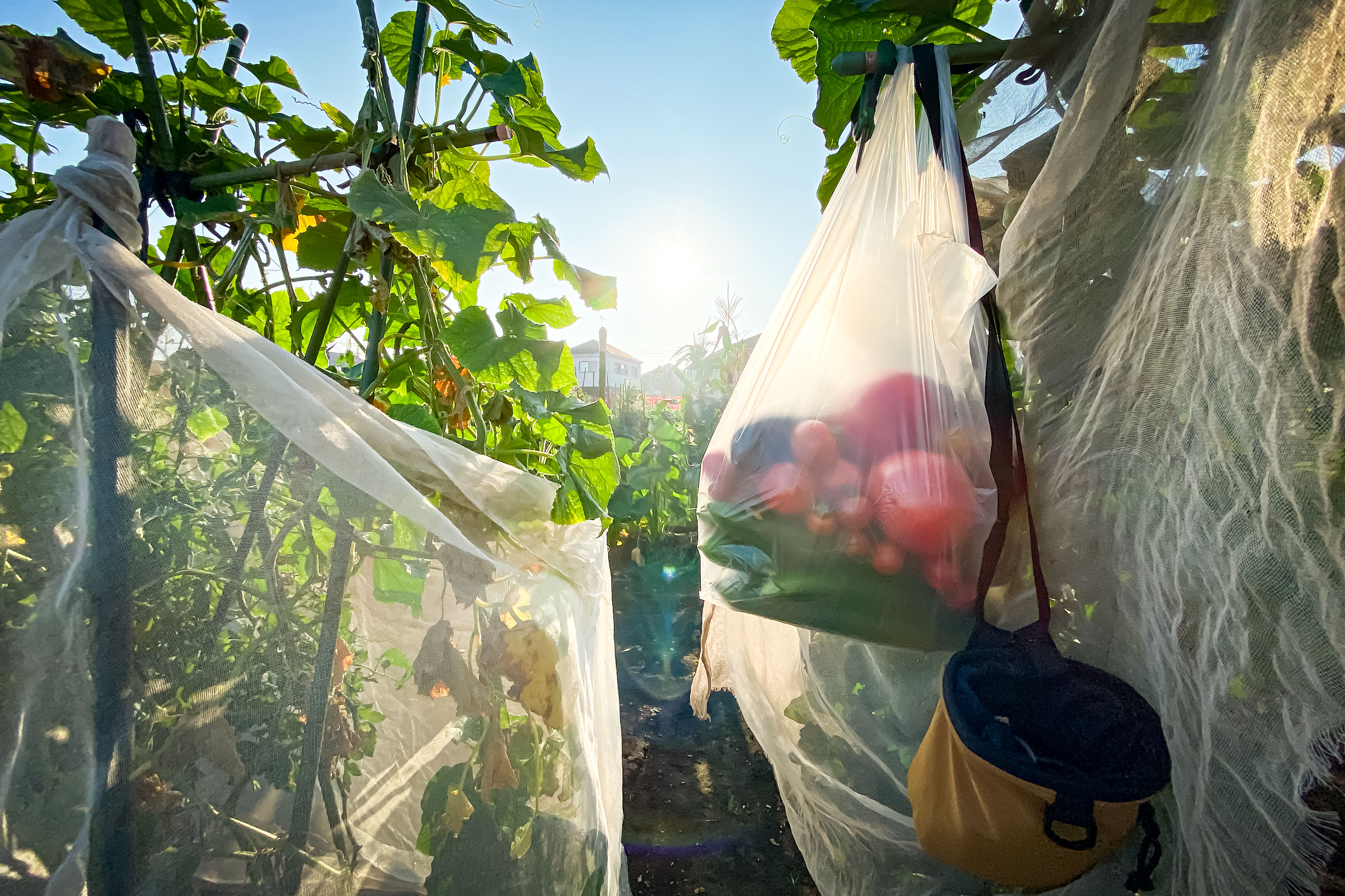 きゅうりとトマトは厳重にネットで囲っていますから今年は虫による被害も大変少なく手入れが楽にできています。