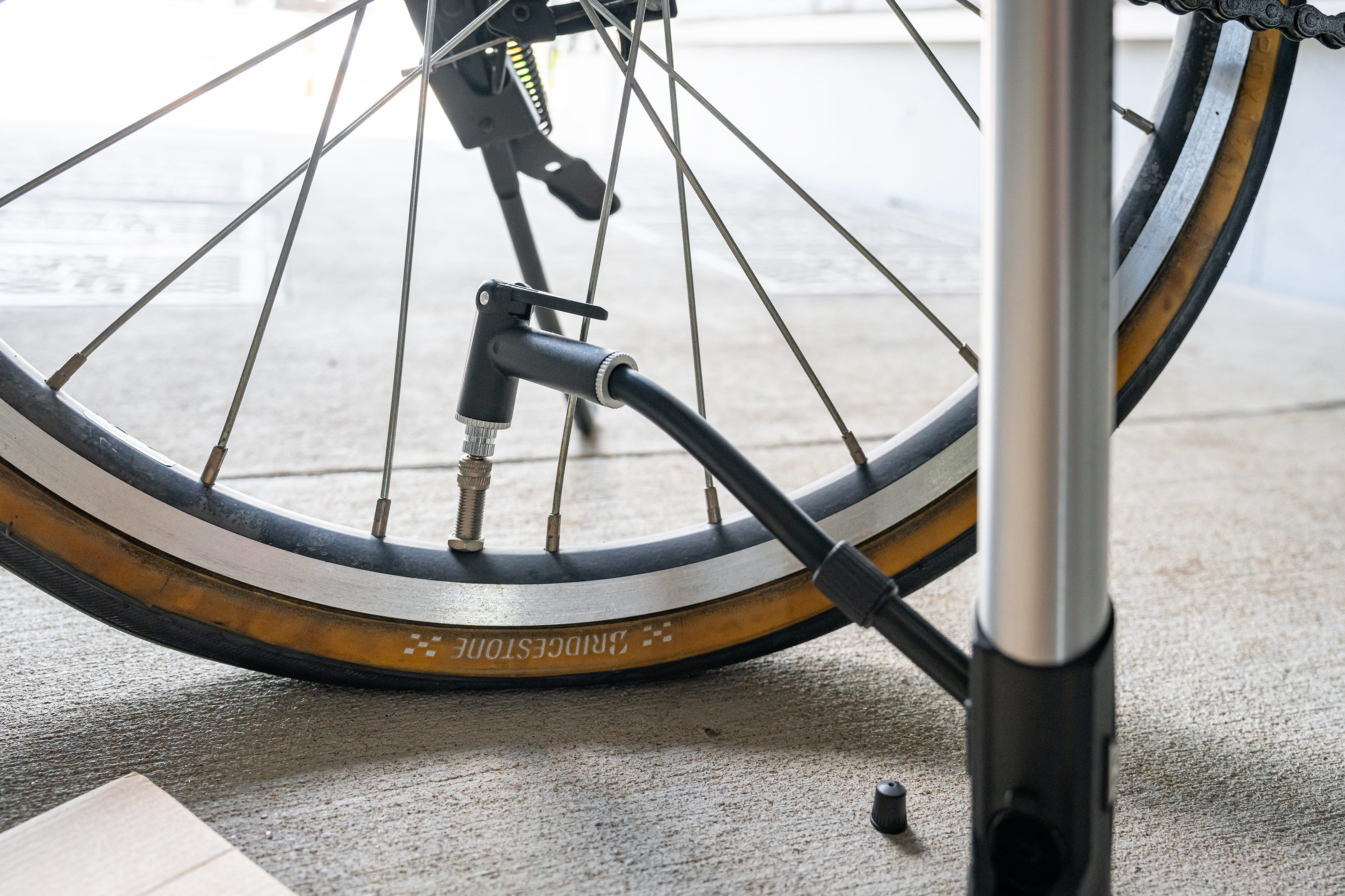 手持ちのポンプを装着した様子がこちら。アダプターの長さ分だけバルブが延長された形になりますから14インチのような極小径車に対しては物理的にエアーポンプの先が入らなくなってしまう場合もあるかもしれませんが、我が家のママチャリ20インチでは問題なく使用することができました。
