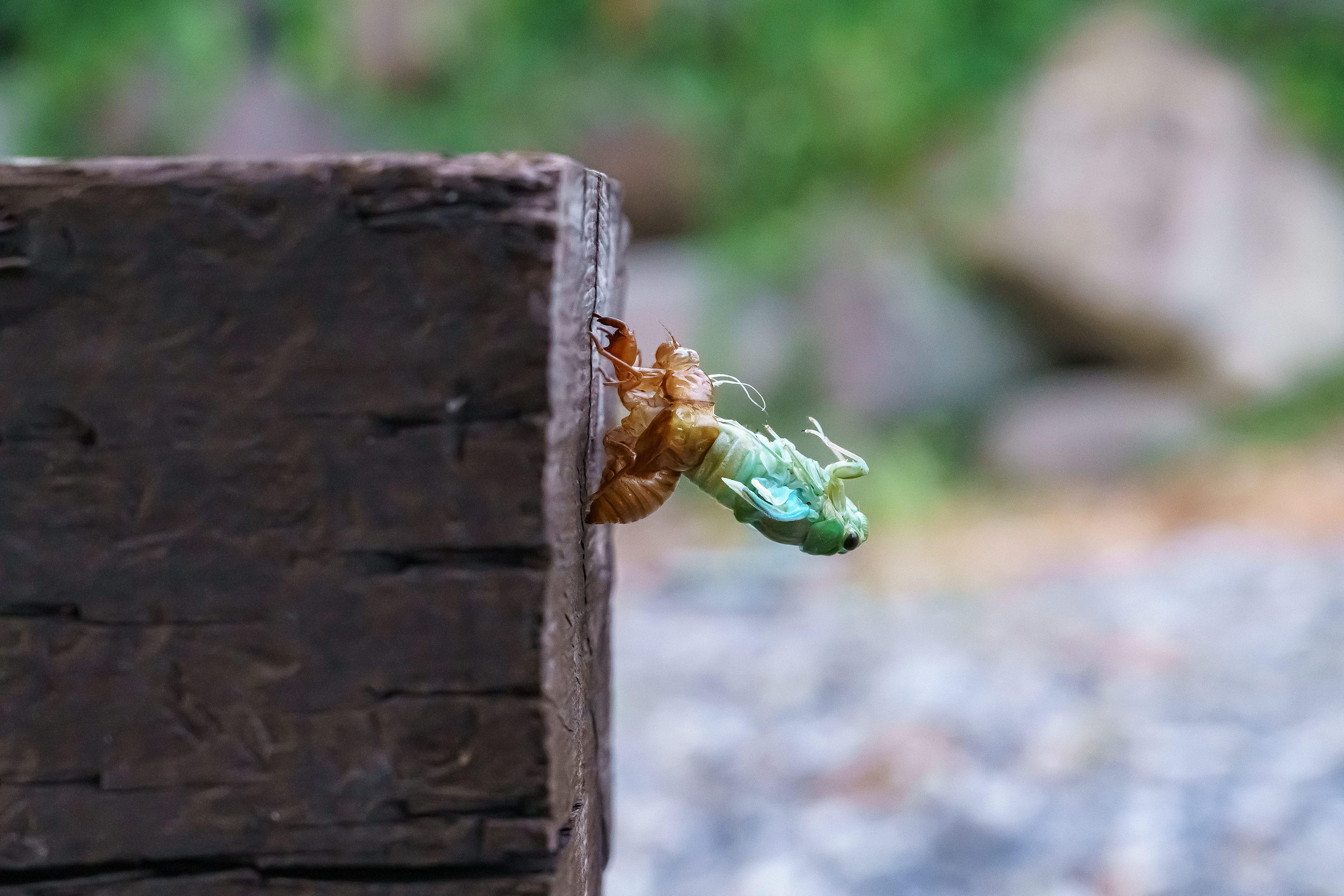 子供の頃見た脱皮の瞬間も確か辺りが暗くなり始めた夕方だった気がします。想像ですが、一番無防備で敵に狙われやすいこの時をなるべく暗い時間とすることで、鳥などから身を守っているんでしょうね。