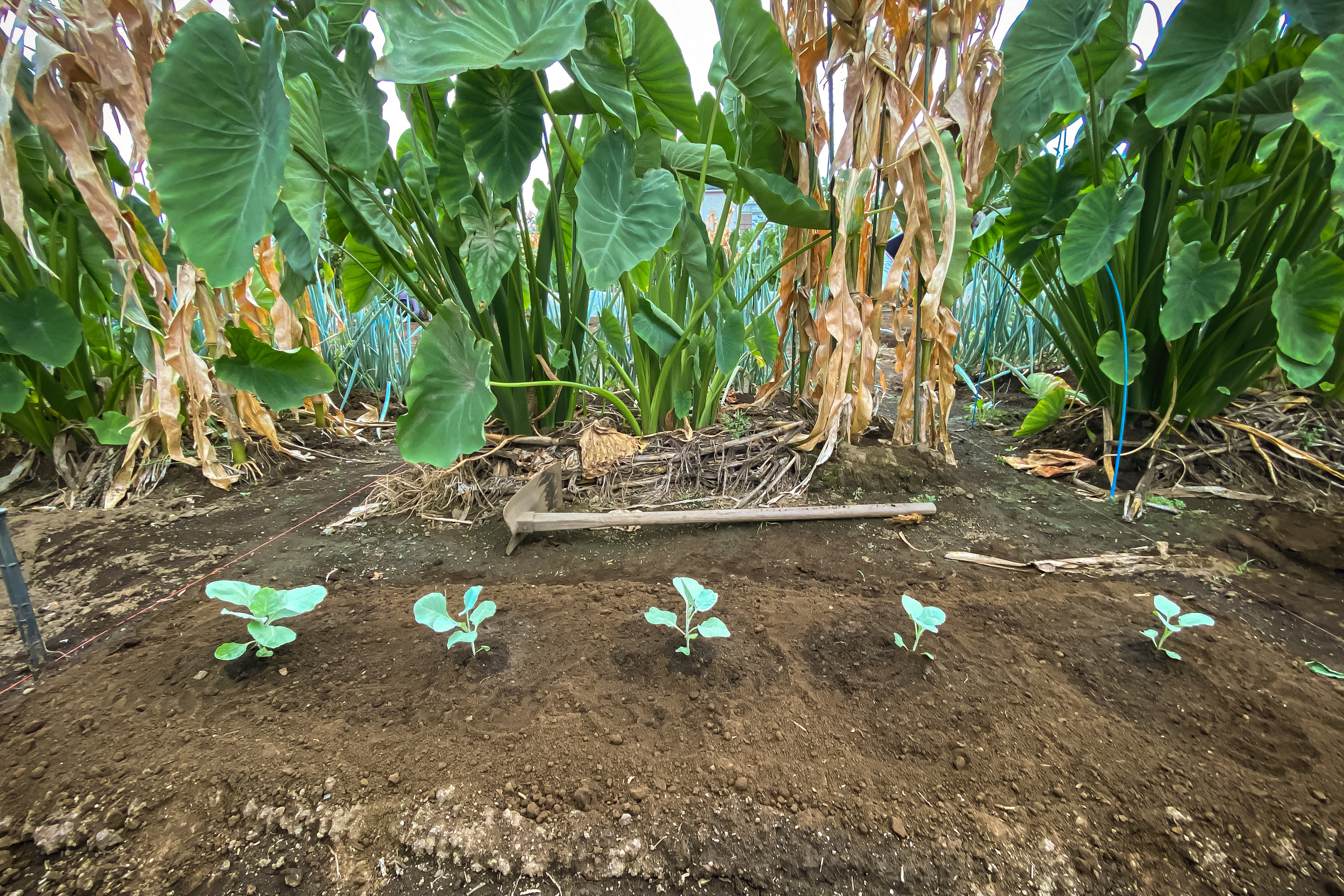 苗のサイズを見ても分かる通り、北側に大きいもの、南側に小さいもの、キャベツに限りませんが植物は大きなものの成長によって隣の小さなものは光が遮られると成長が遅れますから、特にキャベツのように玉になる作物の場合1つの苗の一番外側の葉の広がり方で最終的な玉のサイズが決まってしまうため、成長後のサイズ感を考慮して植える順番と間隔を決めています。
