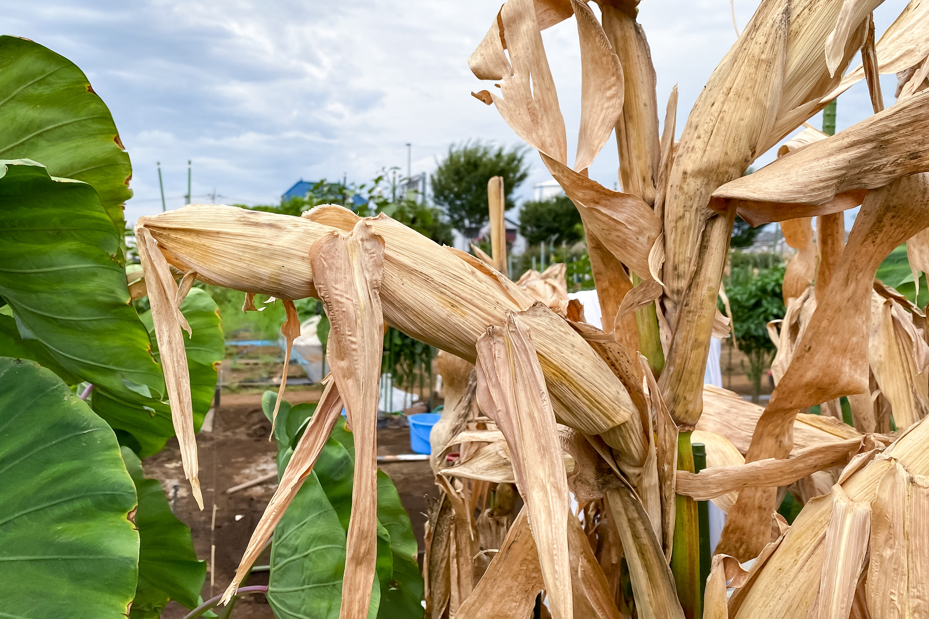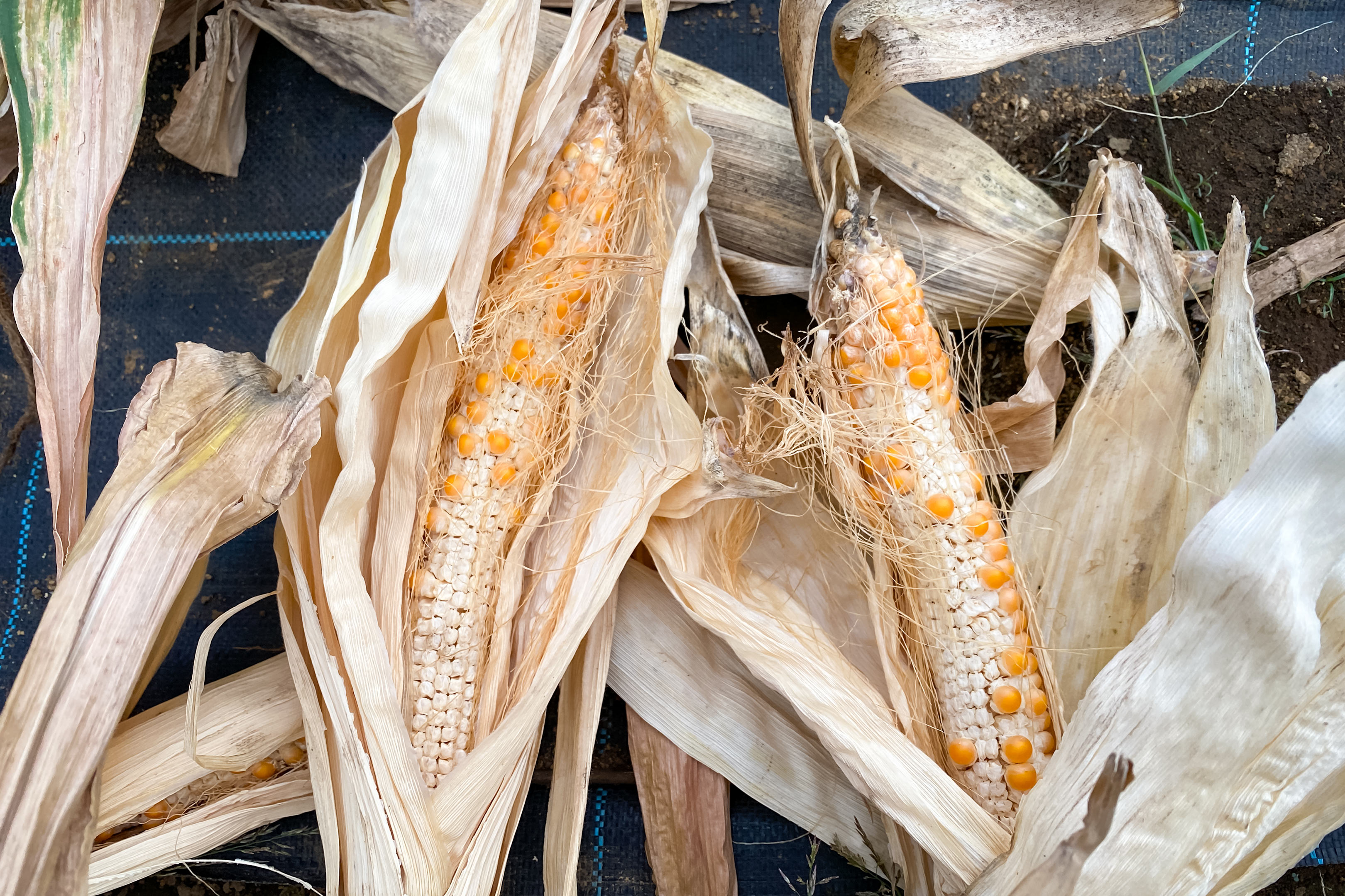 スイートコーンとポップコーン、成長過程や実の成り方に大きな違いはありませんが、収穫に関しては大きく異なる部分があり、スイートコーンはパンパンに実が膨らんだピーク時のおよそ1週間ほどの間に収穫するのに対し、ポップコーンはそのタイミングでは収穫せず太陽熱で木と実がカラカラに乾燥するまで1ヶ月以上畑に放置しておくのが特徴。したがって畑では上の写真のように枯れ木のような姿となります。