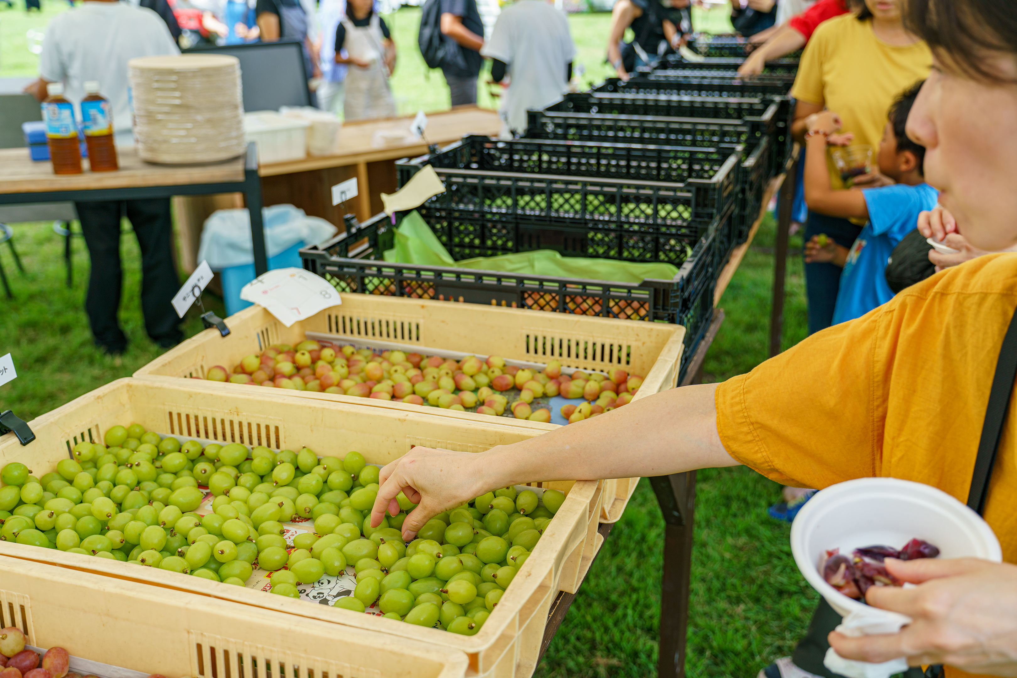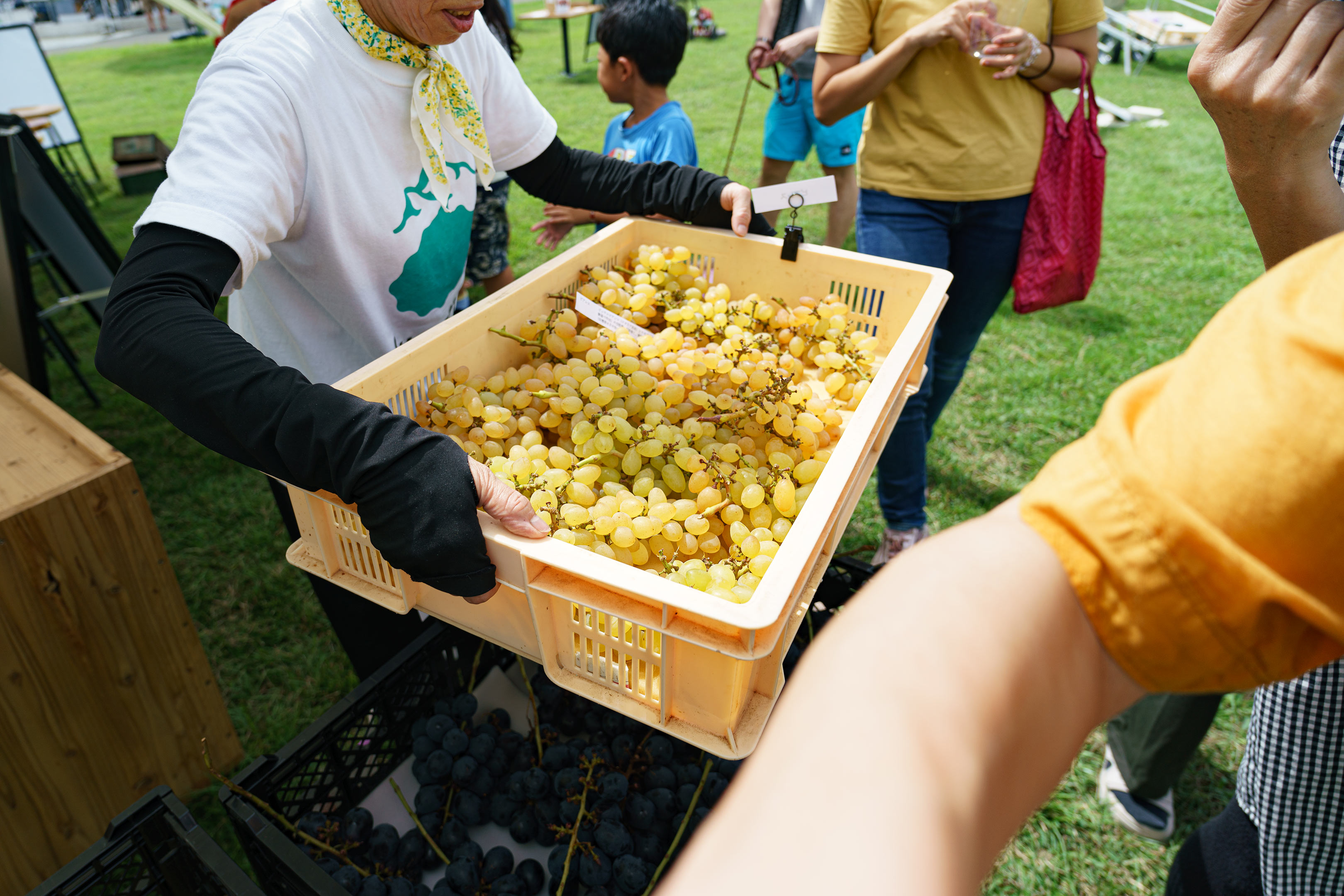 行列の理由はこちら。この時期ならではの ”葡萄の食べ比べ”。看板には10種と書かれていましたが実際には17種類も並んでいたようです。食べ比べの他には詰め放題というのもありまして、中サイズ大サイズそれぞれのカップに好きなだけ葡萄を詰め込んで帰ってください!というチャレンジも行われておりました。
