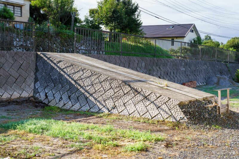 壁が汚いのはまだ洗っていないからで、この後ケルヒャーで高圧洗浄する予定。そして高さ2メートルほどの道路からは急にスロープが無くなったため歩道から人が落ちてはいけませんので、同時に安全柵が設置されます。写真は設置前に撮ってしまったのでまだ赤いコーンが置かれております...。