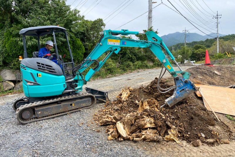 古い木の切り株ですから素人考えでバックフォーでガツンと掘り起こすだけで簡単に撤去できると思っていたのですが、実際始めてみるとバックフォーでは歯が立たず、こちらもコンクリートを砕く重機(ブレーカー)を使って少しずつ木を砕いて根っこまでをバラバラにする必要がありました。安易にお願いしてしまってスミマセン。
