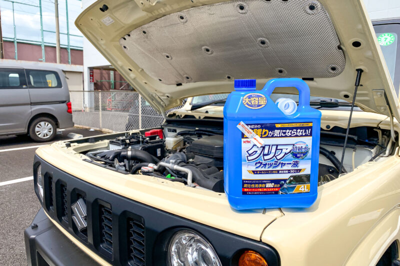 新型ジムニーのウォッシャー液タンク容量は4Lと言われており、その数値が正しくタンク内が空っぽならばこれ1本全投入できるはずですが、あまり満タンにしすぎて走行中にエンジンルーム内のタンクからこぼれたりするのは嫌なので、今回は3L程を投入し残りは自宅ストックとしました。
