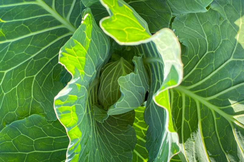 いっぽうこちらのキャベツですが、同様のスケールで写真を撮っているにもかかわらず中央付近が結球していないのが明らかです。こちらのキャベツは1枚目の写真とは違いポイントワンという品種なので全く同じように結球するとは限りませんが、少なくとも新藍よりも早く大きく成長するはずなのにこの時期になっても結球していないのです。