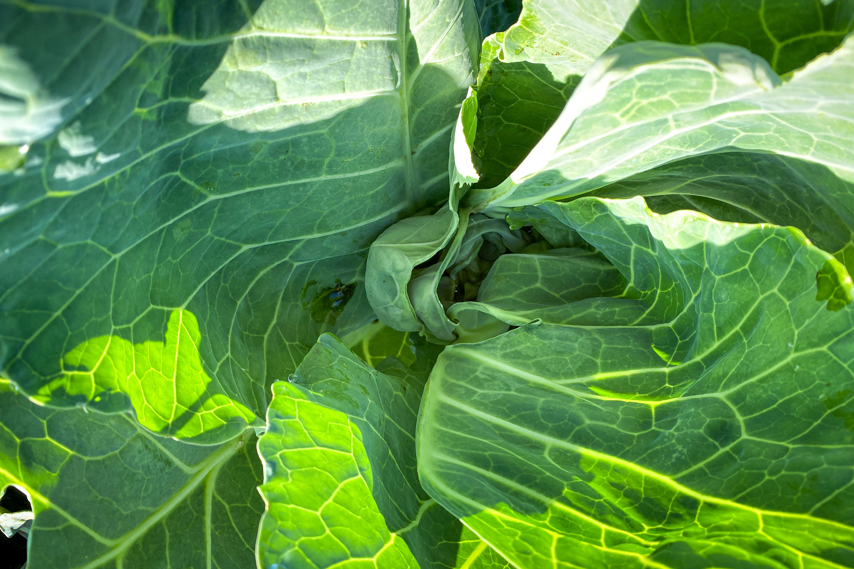 実はこのポイントワンは苗を定植後数週間後に ”芯食い虫” に食べられまして、その名の通り作物の芯を食べてしまうのでキャベツで言うとそこが成長点、一番大事なところを若いうちに食べられたせいで成長が著しく低下し結球していないのではないかと思います。もしかするとまだ中心付近には虫が残っているのかも...。多分今年このキャベツは食べられないですね。