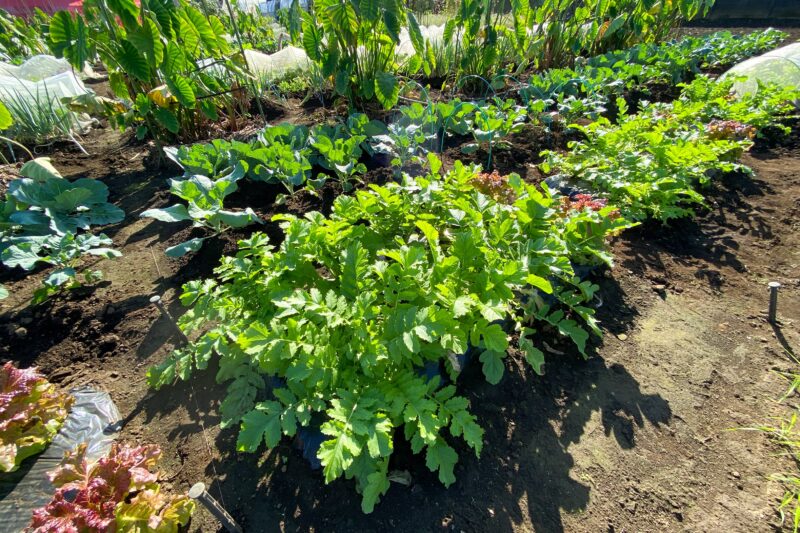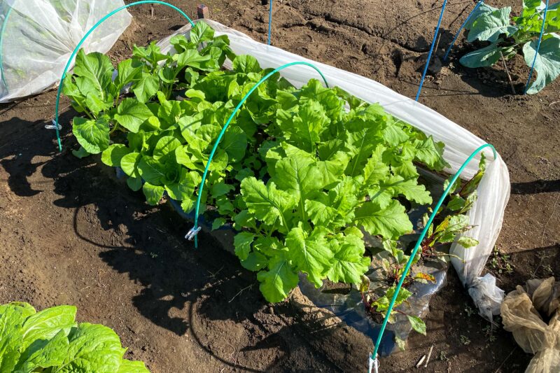 こちらはオータムポエム、白カブ、赤カブ、タイニーシュシュ、ビーツの畝。これまたかなりモサモサに茂っております。