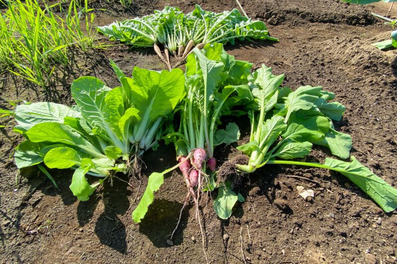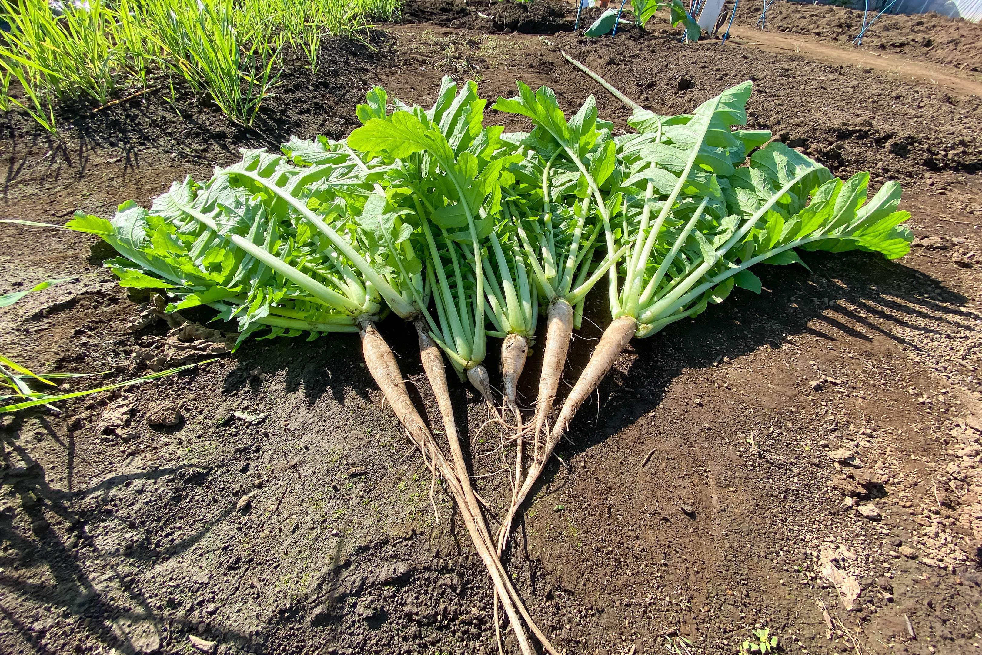 抜き取ったのがこちら。左2本が聖護院、真ん中2本がおふくろ、右の2本が青首。聖護院大根って成長するとまんまるで巨大なカブみたいな形状になるのですが、こうしてみると現時点では一際細長い大根なんですね。逆におふくろ大根は結構長く大きく成長するのに現時点では一番短いです。もしかすると聖護院とおふくろがこの時点で逆に見えます。植える場所を間違えたかな?