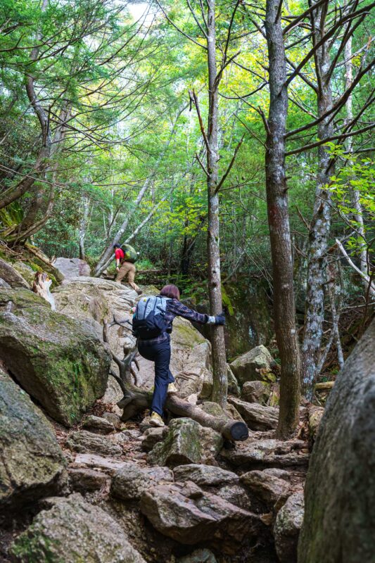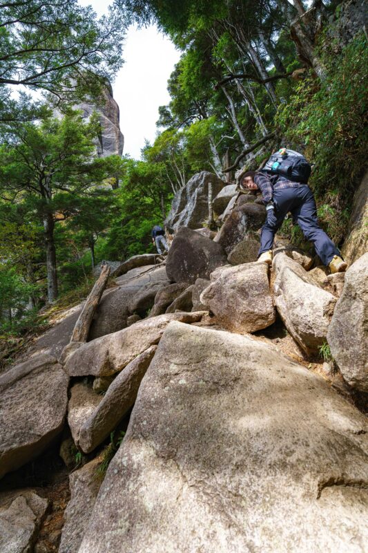 桃太郎岩から先の登山道はそれまでの穏やかな山道とは打って変わって急に岩場になります。その岩も一つ一つが結構大きく足元を取られやすいので注意が必要です。