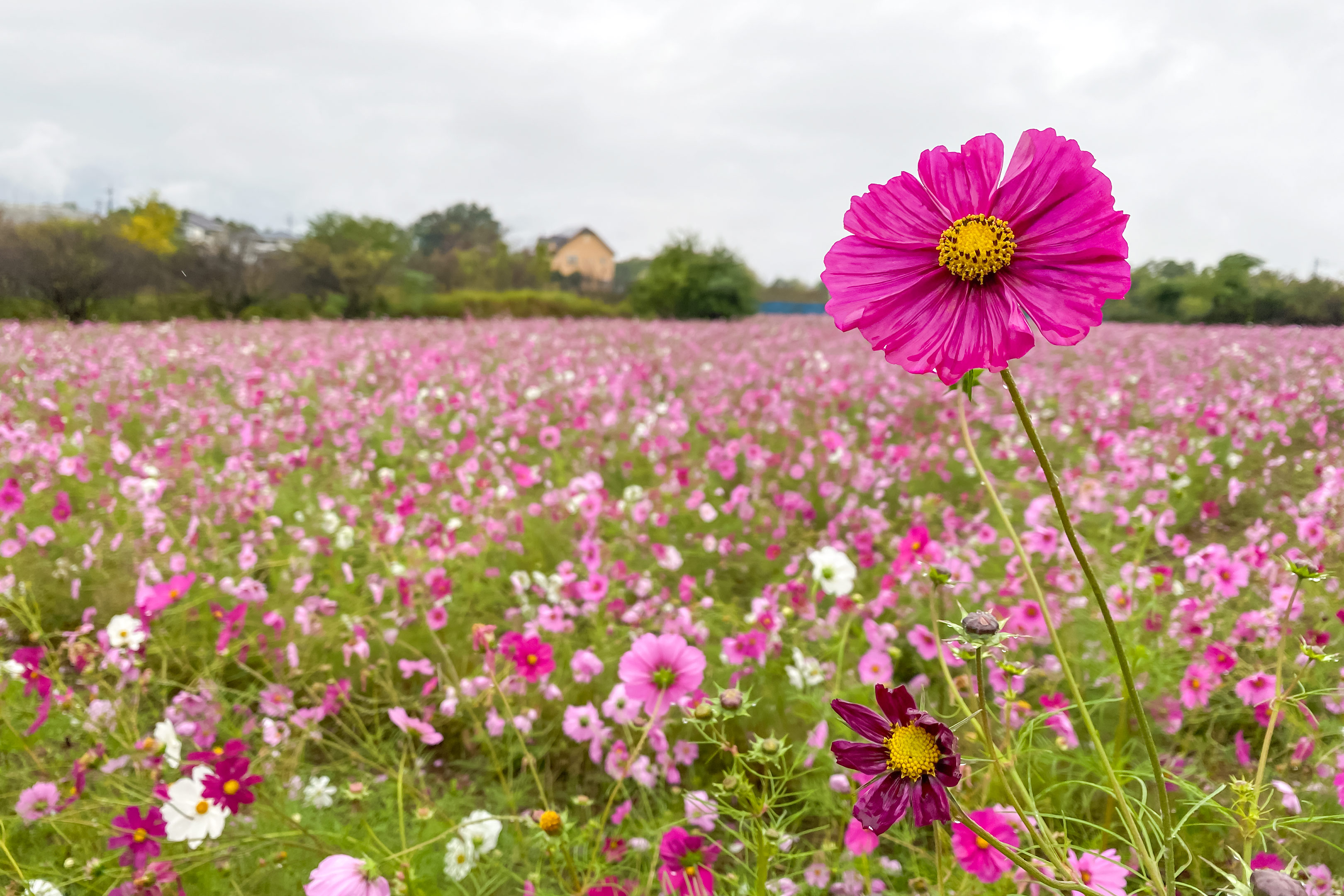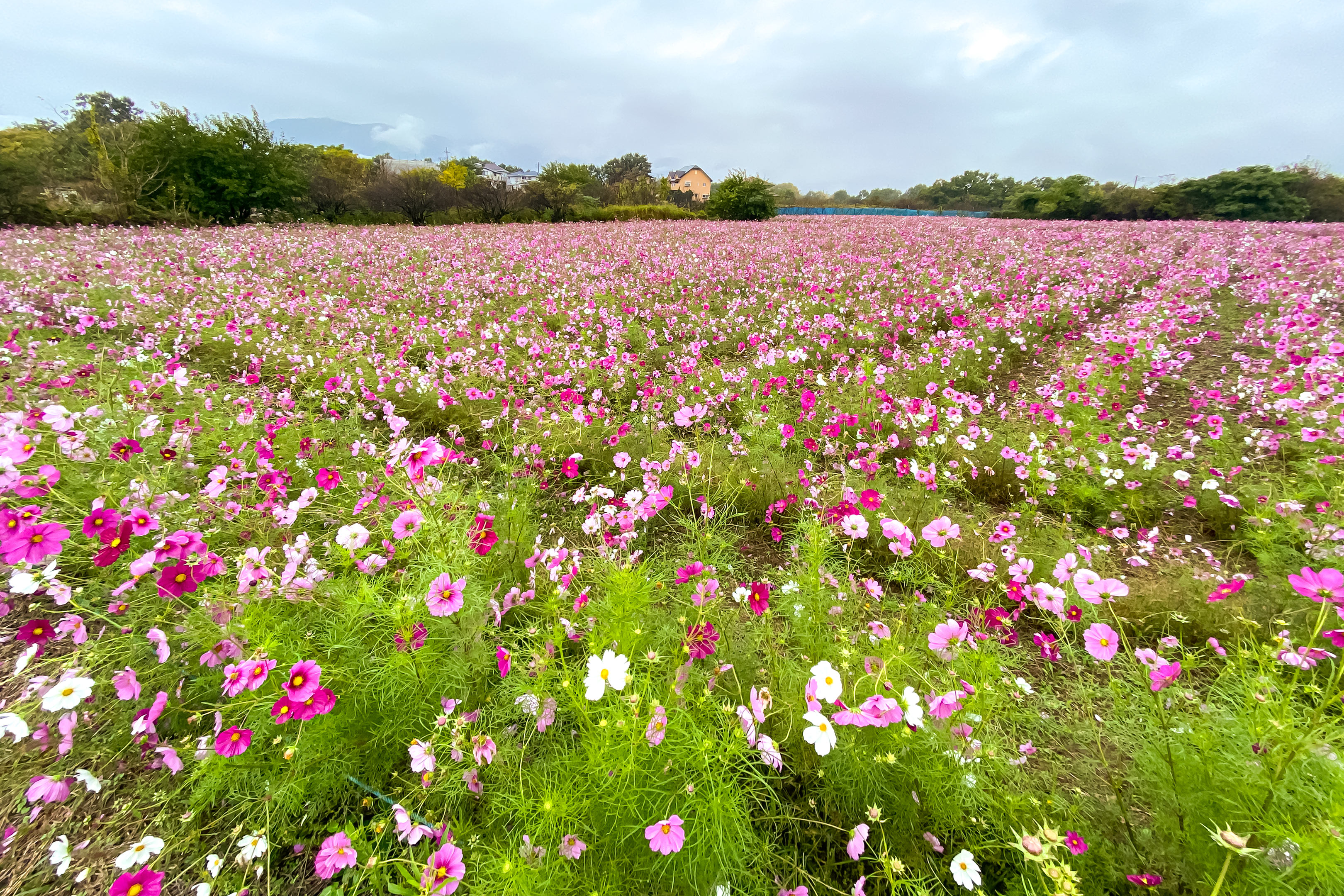 今日は道路沿いに広がった満開のコスモス畑を見つけ思わず車を停めて写真に収めました。これだけの規模で咲くコスモスはなかなか他では見たことがなく、田舎育ちの私でも圧倒されたわけですが、不思議と周囲に人気(ひとけ)はなく我が家だけの貸切状態。天気が良ければ更に綺麗に見えるでしょうね。