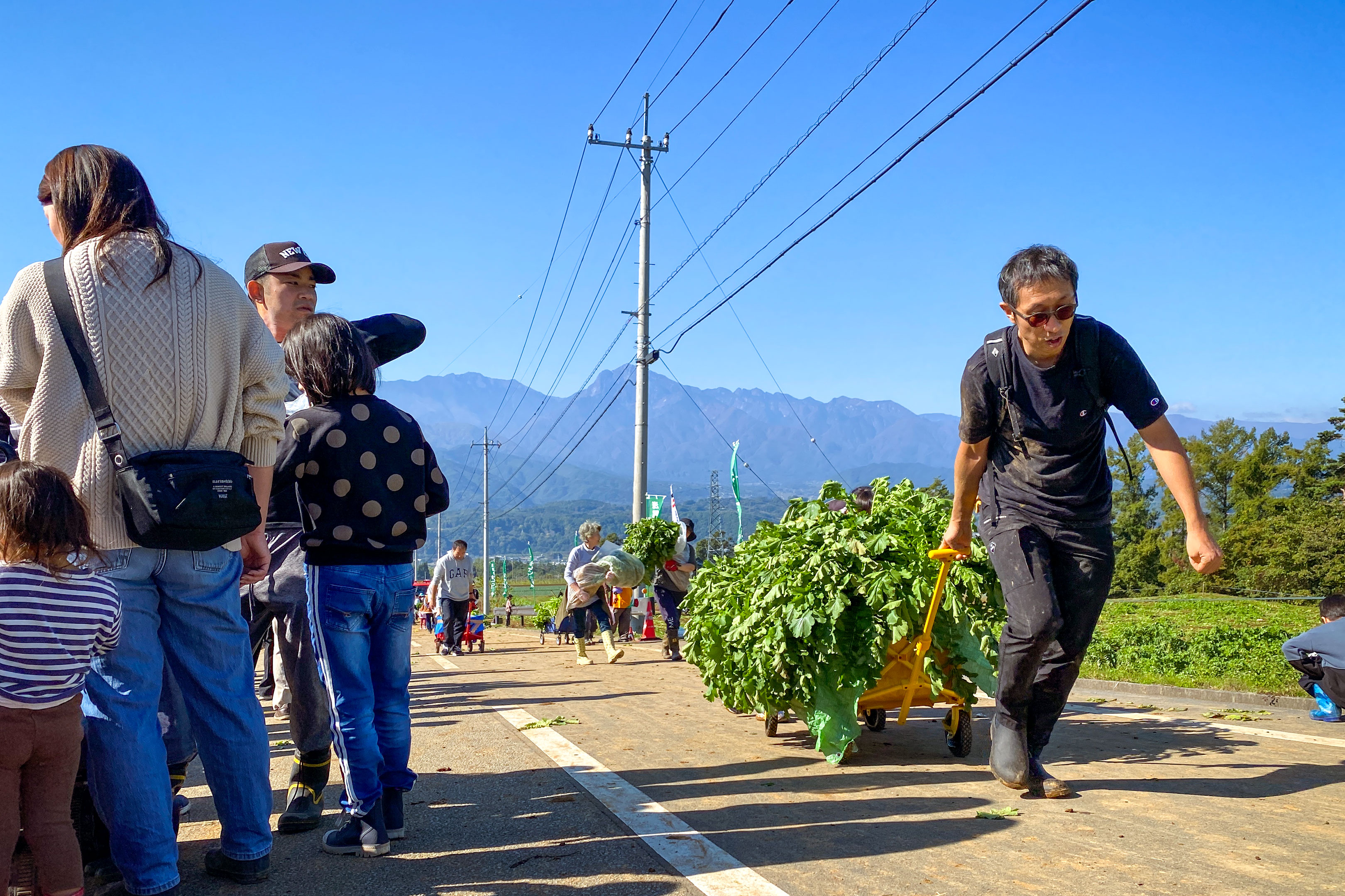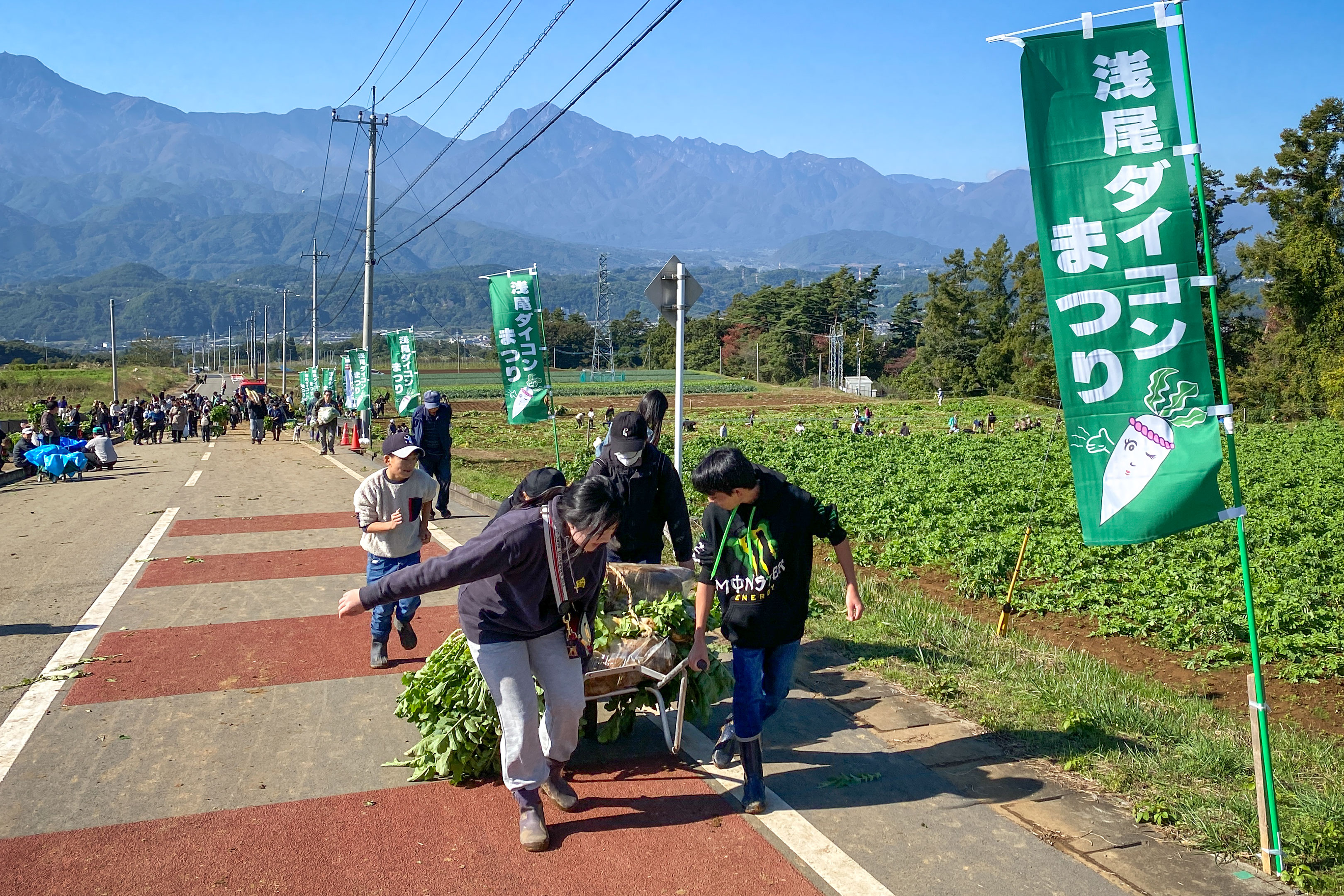 実はこのダイコン収穫体験は、規定の袋に詰め放題制になっており、20リットルのゴミ袋くらいのビニールに少ない人でも5本くらい、多い人だと8本〜10本くらいは詰めています。それもここ北杜市浅尾の浅尾大根は大きいんですよ!一般的な大根が1本平均1.2kgと言われるところ、浅尾ダイコンは1本で2kgくらいはあると思います。それを5本詰めたら重量は10kg、10本詰めたら20kgです。家族4人で全員が一袋ずつ参加したとしたら4倍の40kg〜80kg。もう人の手では運べないわけです。