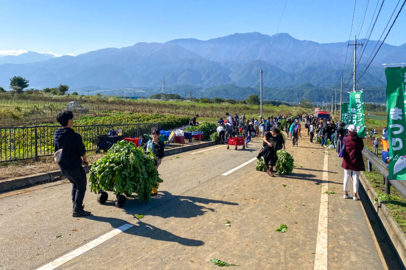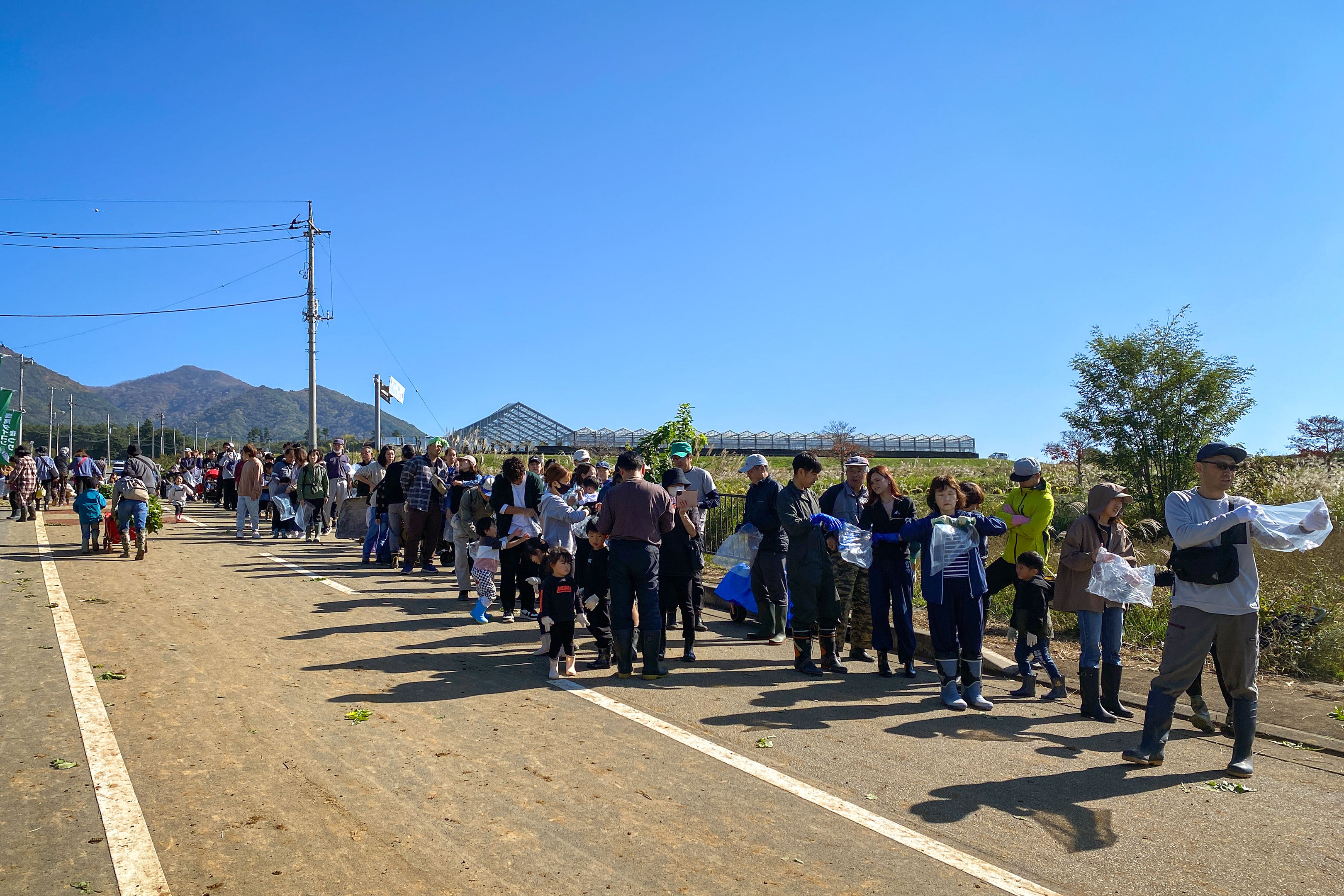 生成AIで「畑作業をする沢山の人」というテーマで画像を作らせたらこんな感じになりそうな光景。でもこれ生成AIじゃないですよ。今日のお祭りのメイン会場の様子です。