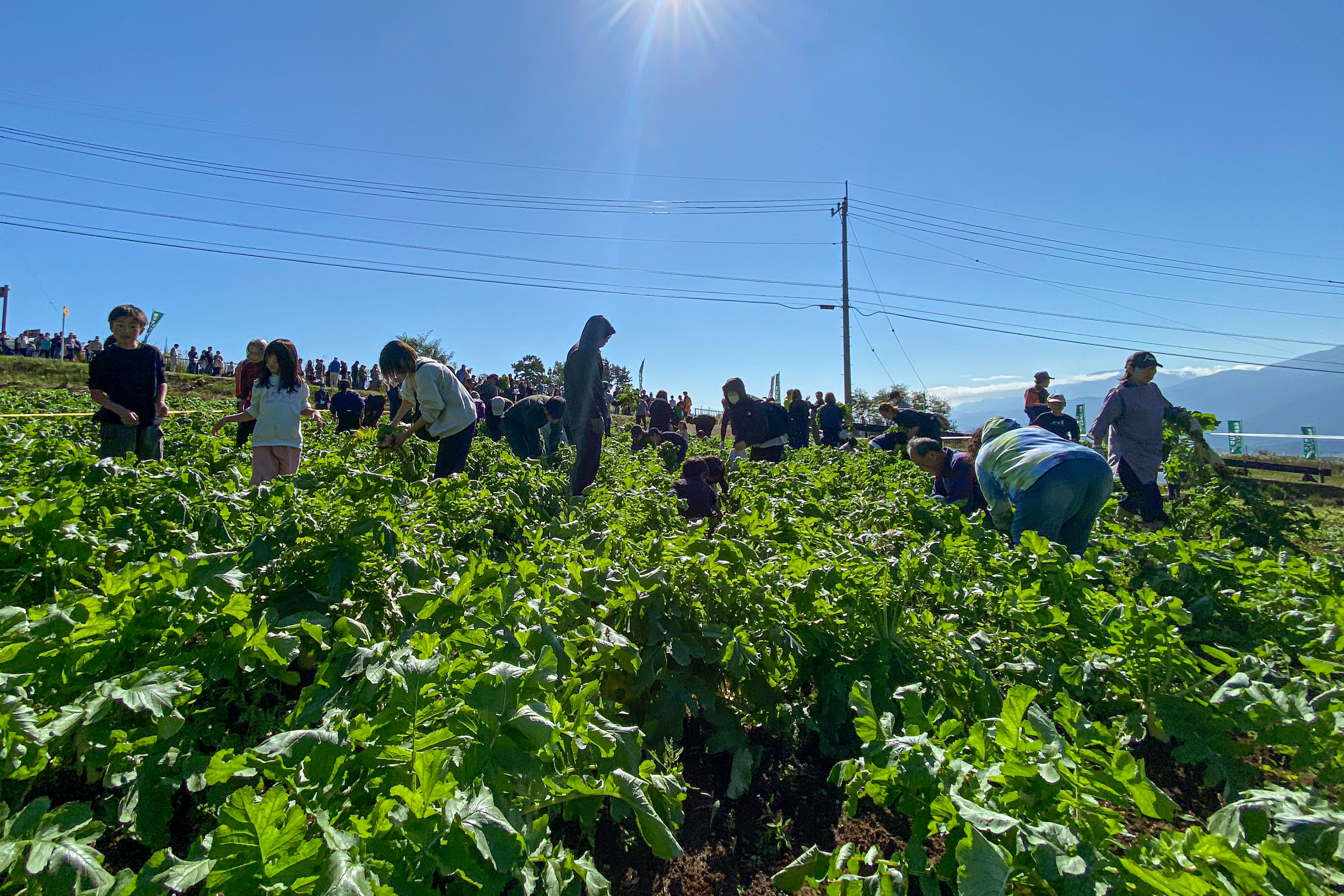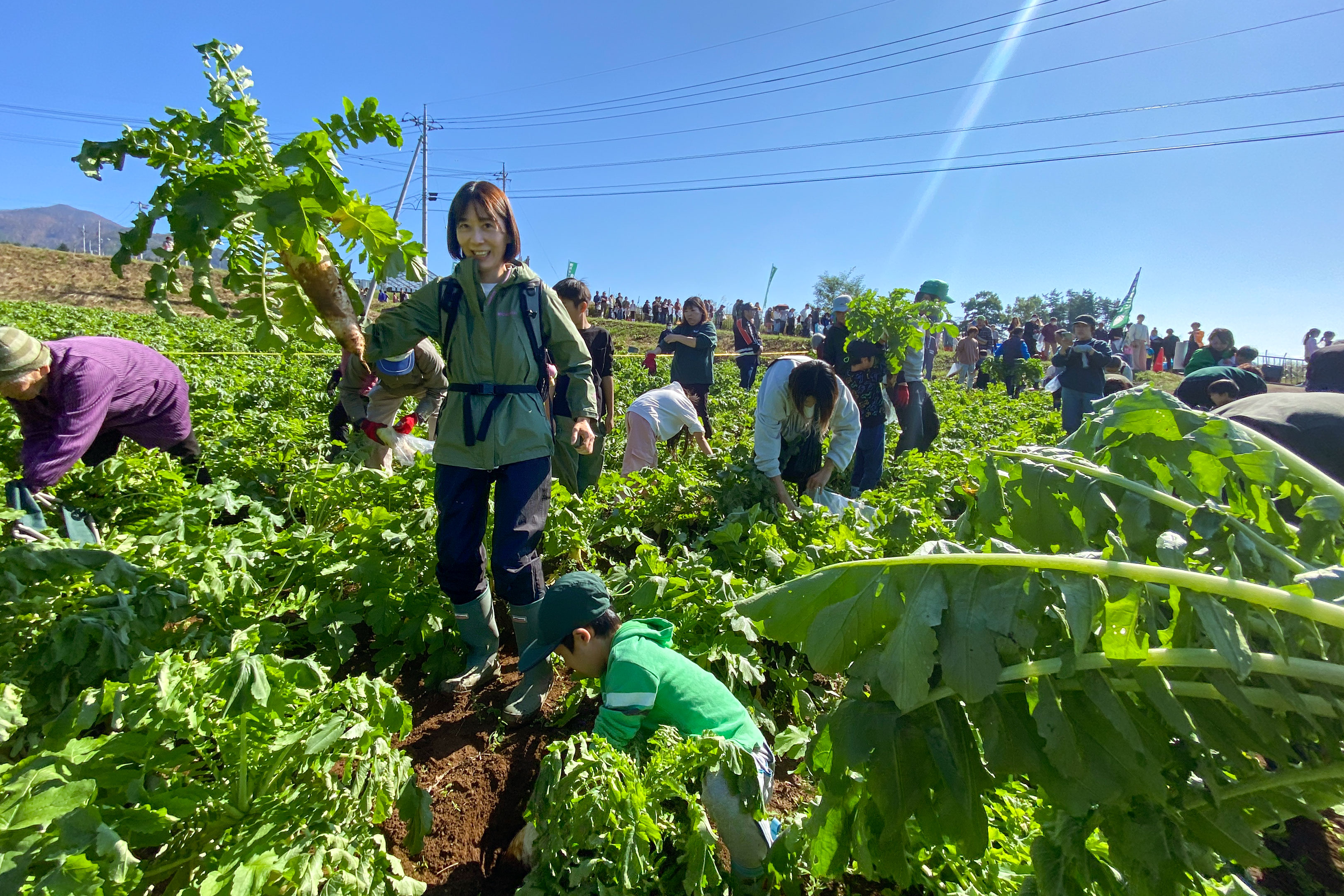 受付を済ませるまでに30分以上は待ったでしょうか。そしてようやくダイコン畑の前まで入場出来たものの、またもここでストップ。参加者を野放しに自由入場させてしまうと畑が荒れてしまったり、後から受付をした人のダイコンが無くなってしまうので、入場は畑の中を区画で区切って50名くらいずつ...というルールで行われておりました。