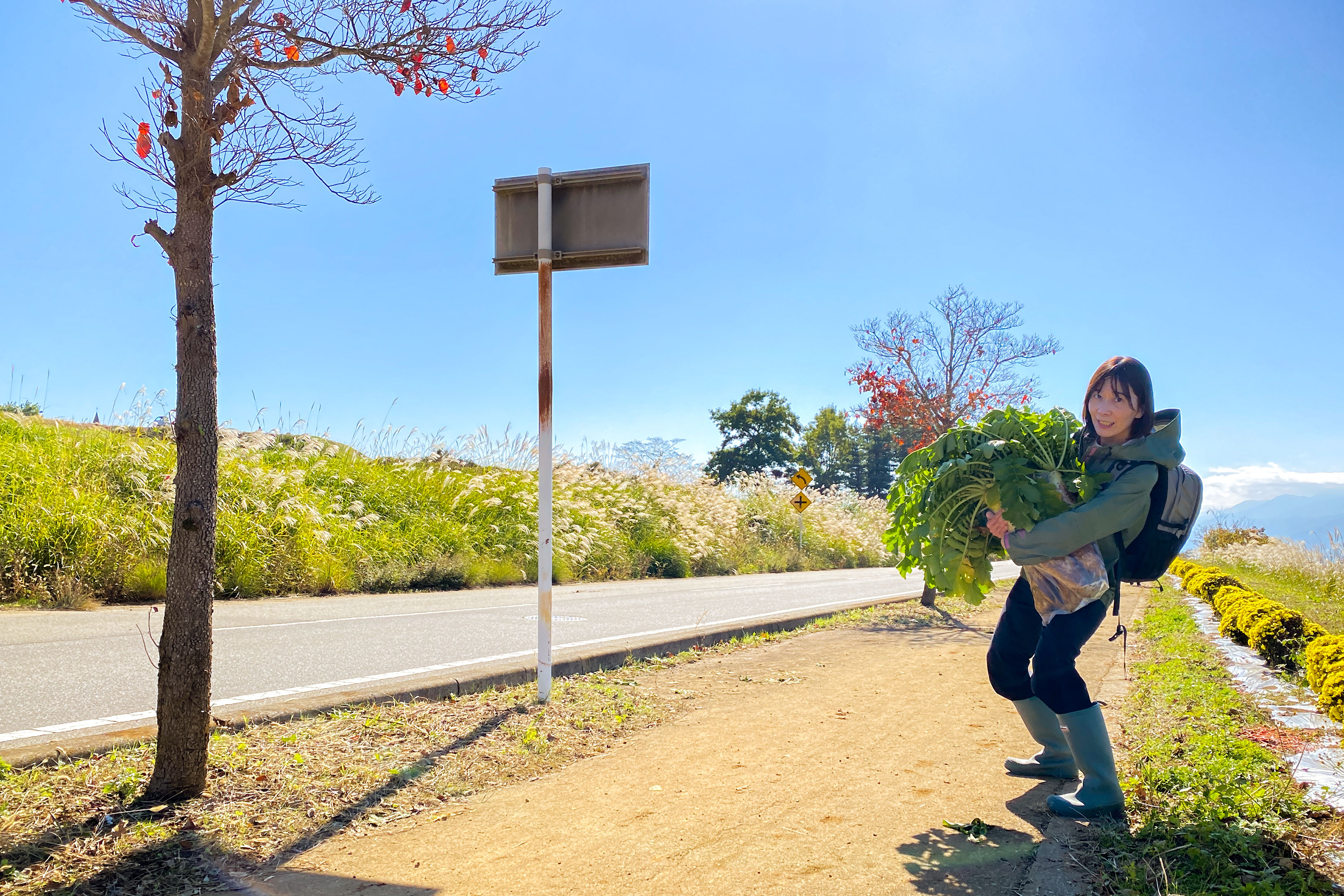 だって本数もさることながら、先に書いたようにこの大根は1本2kgくらいありますからそれが6本だと10kgオーバー。冷静に考えればそれを1.6km先の駐車場まで担いで運ばなければならないわけです。それ以上詰めて重くしてしまったらもう素手では持って帰れませんよ。