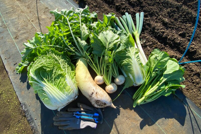 今回の収穫。昨日掲載した収穫日から数日のスパンで今度はこれだけの量です。白菜なんてこれでミニサイズですからね。ミニというのは名前だけで完全にフルサイズの白菜になってしまいました。大根は間引き用(つまり本ちゃん用はまだ畑に全部植っている)にもかかわらず2kgくらいにまで成長しています。これらどう見ても鍋メニュー用ですね。