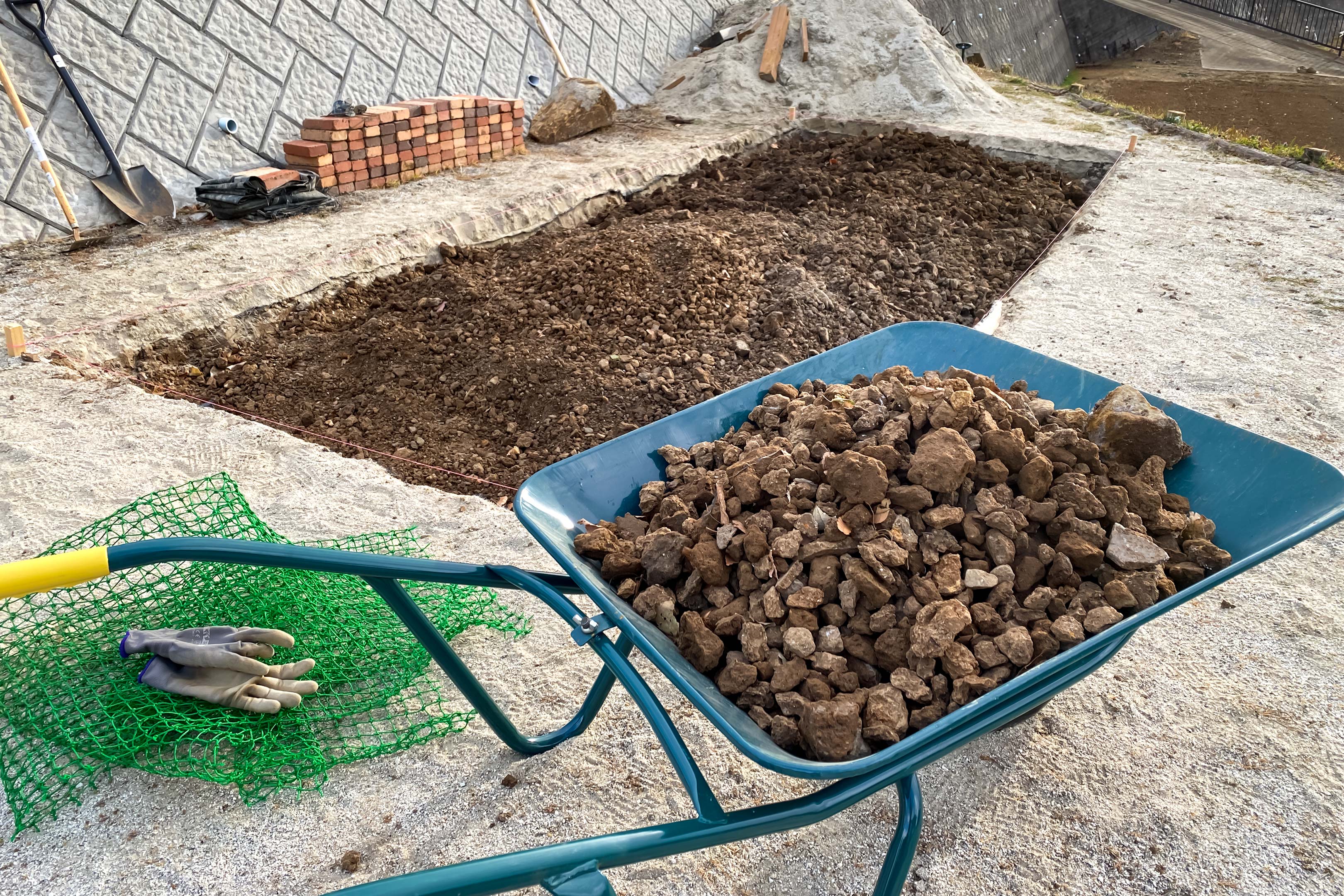 土壌改良剤や籾殻を投入するのはせめて10mm程度の砂利までを取り除いてからと思っているので、差し当たり年内の目標はにそこがターゲットとなります。