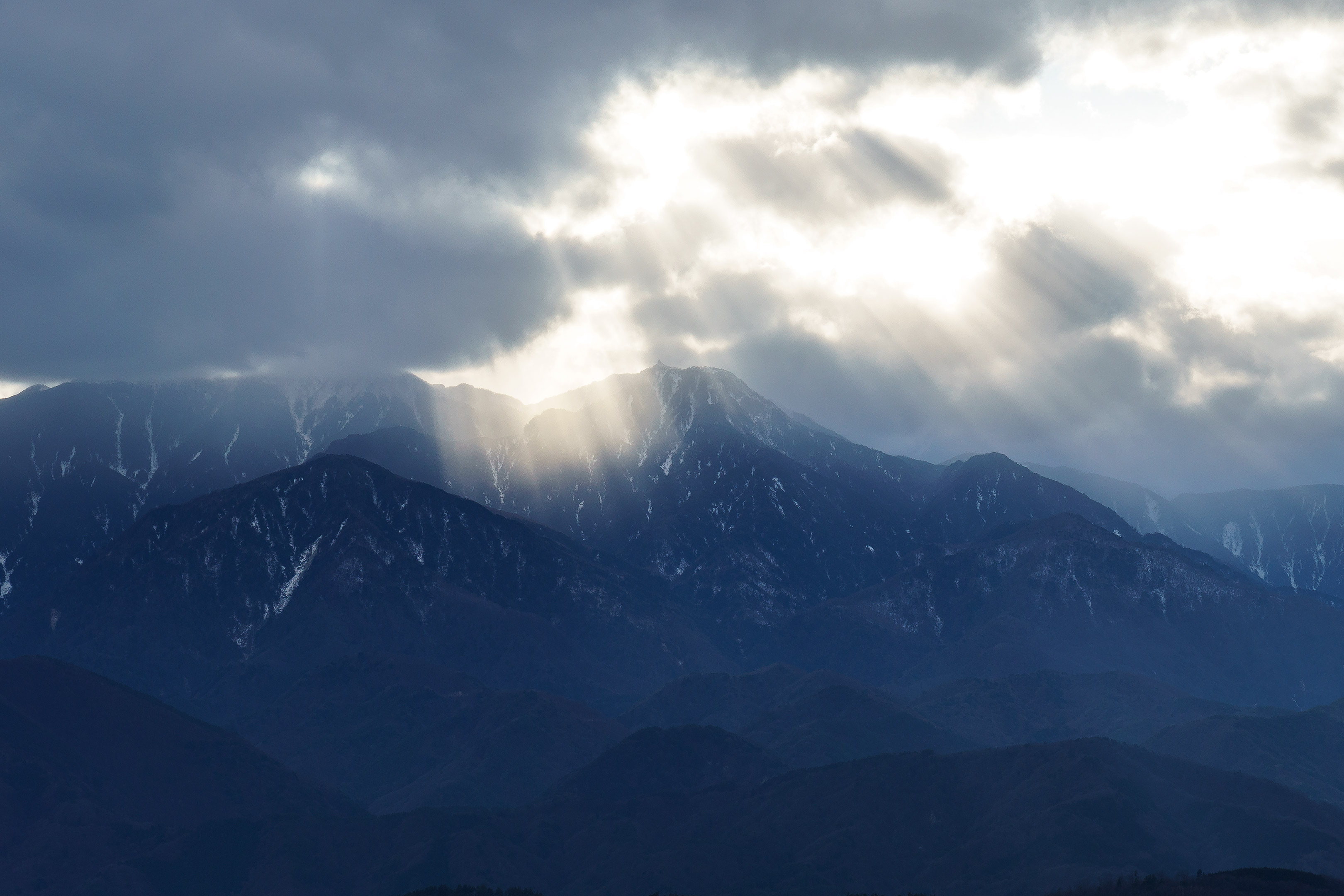 山梨の我が家から南アルプス方面を見ると冬はこうした寒そうな景色が広がっていることが多いです。3,000メートル級の山々が連なっていますからきっとあの山頂付近はマイナス20℃くらいの極寒なんでしょう。明らかに吹雪いているな!っていう雪雲が2、3日くらいの頻度で山頂付近を覆っています。