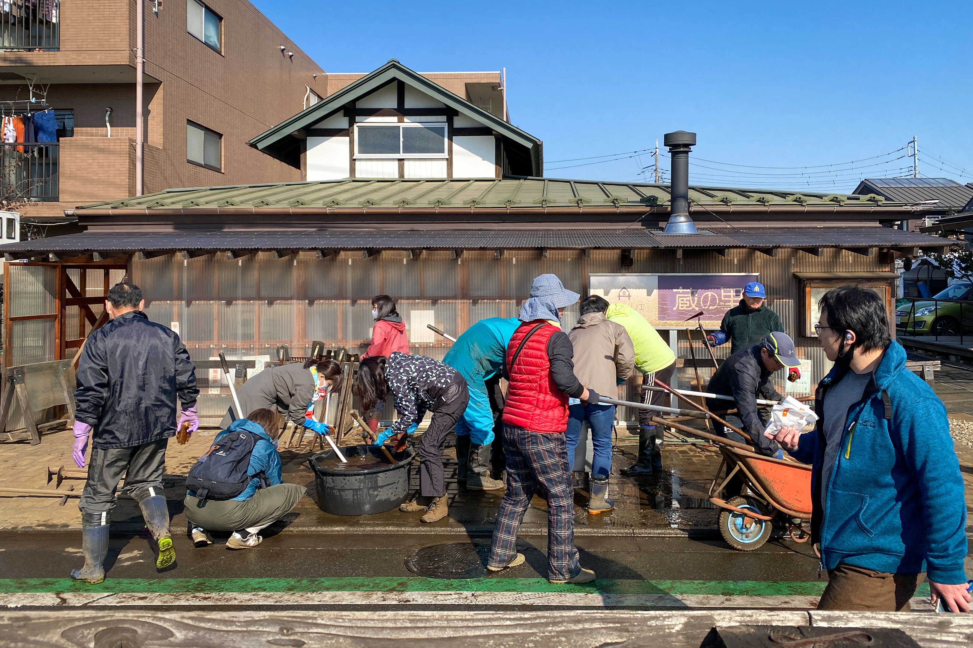 農機具の手入れもしっかり行います。三角ホー、クワ、ジョウロといったお馴染みの道具は全て綺麗に水洗い。皆がやる気満々ですから手分けをすれば数十本の道具もあっという間にピカピカになります。