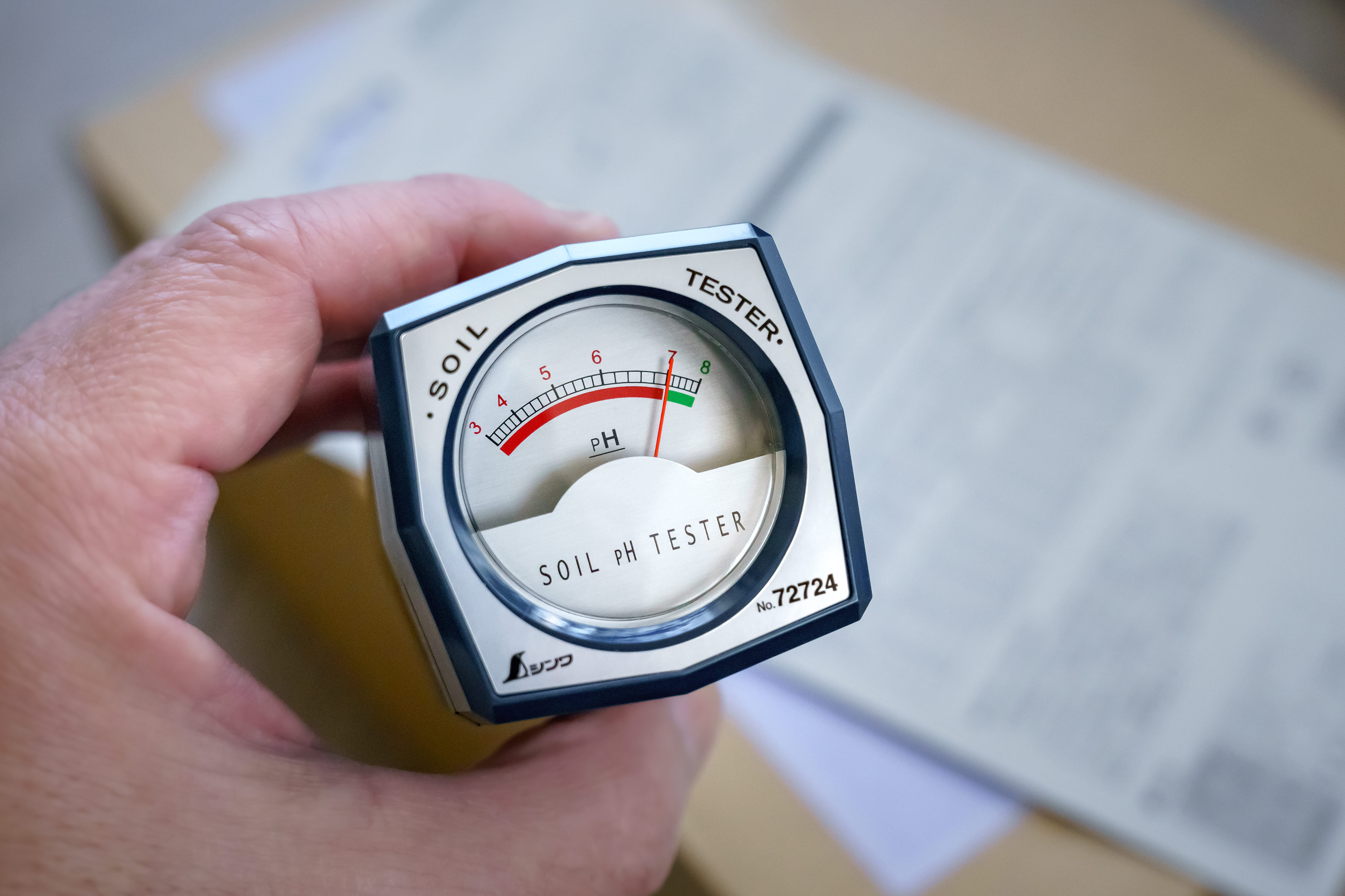 肥料分は足りなければ追肥すれば良いですが、作物を定植する前に安定させておかなければならないのが土壌酸度。pHと書いて「ペーハー」と昔は読みましたが最近は「ピーエイチ」と呼ぶそうです。土壌が酸性なのかアルカリ性なのかその度合いを数値的に把握、管理に役立てるための測定器が土壌酸度計。