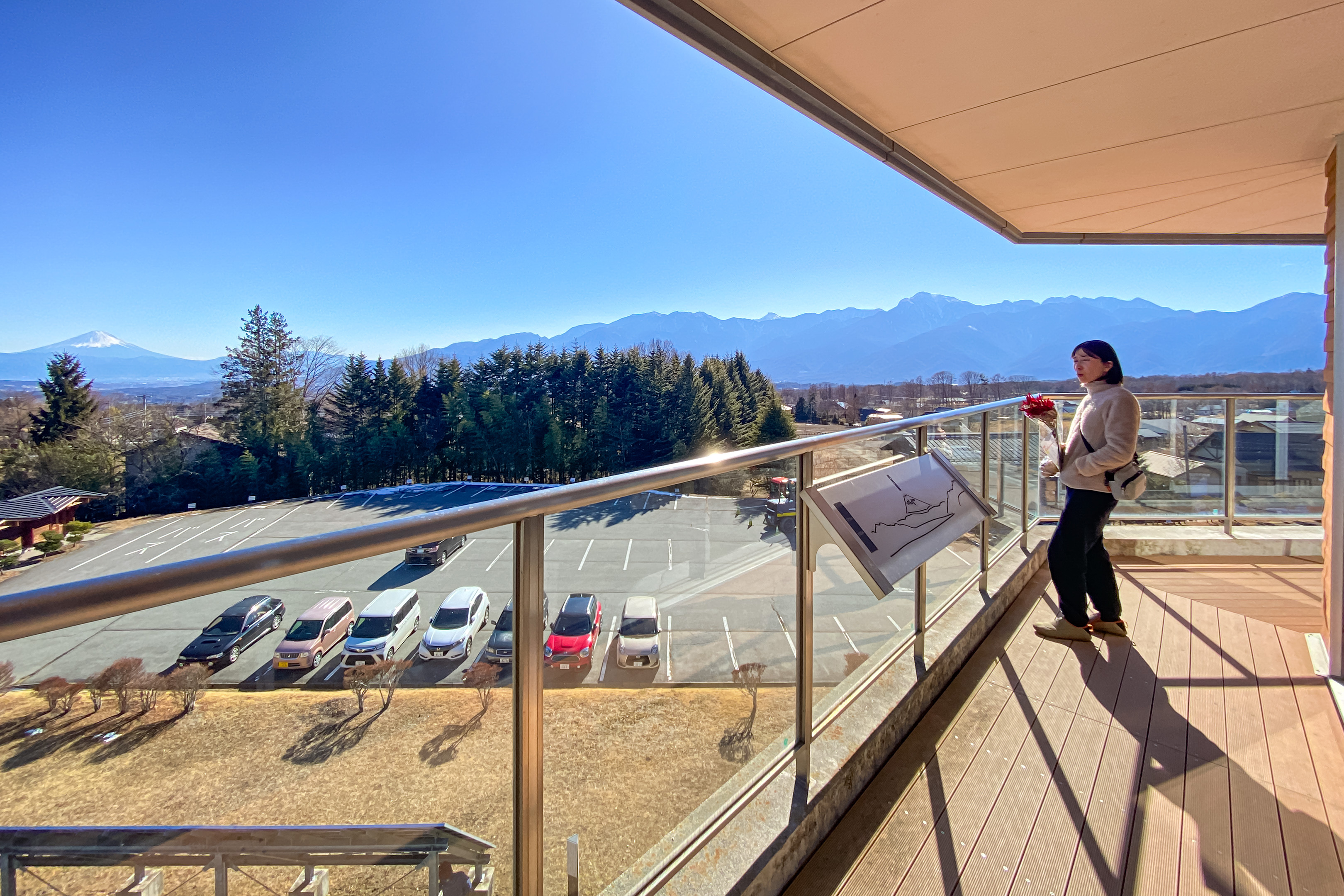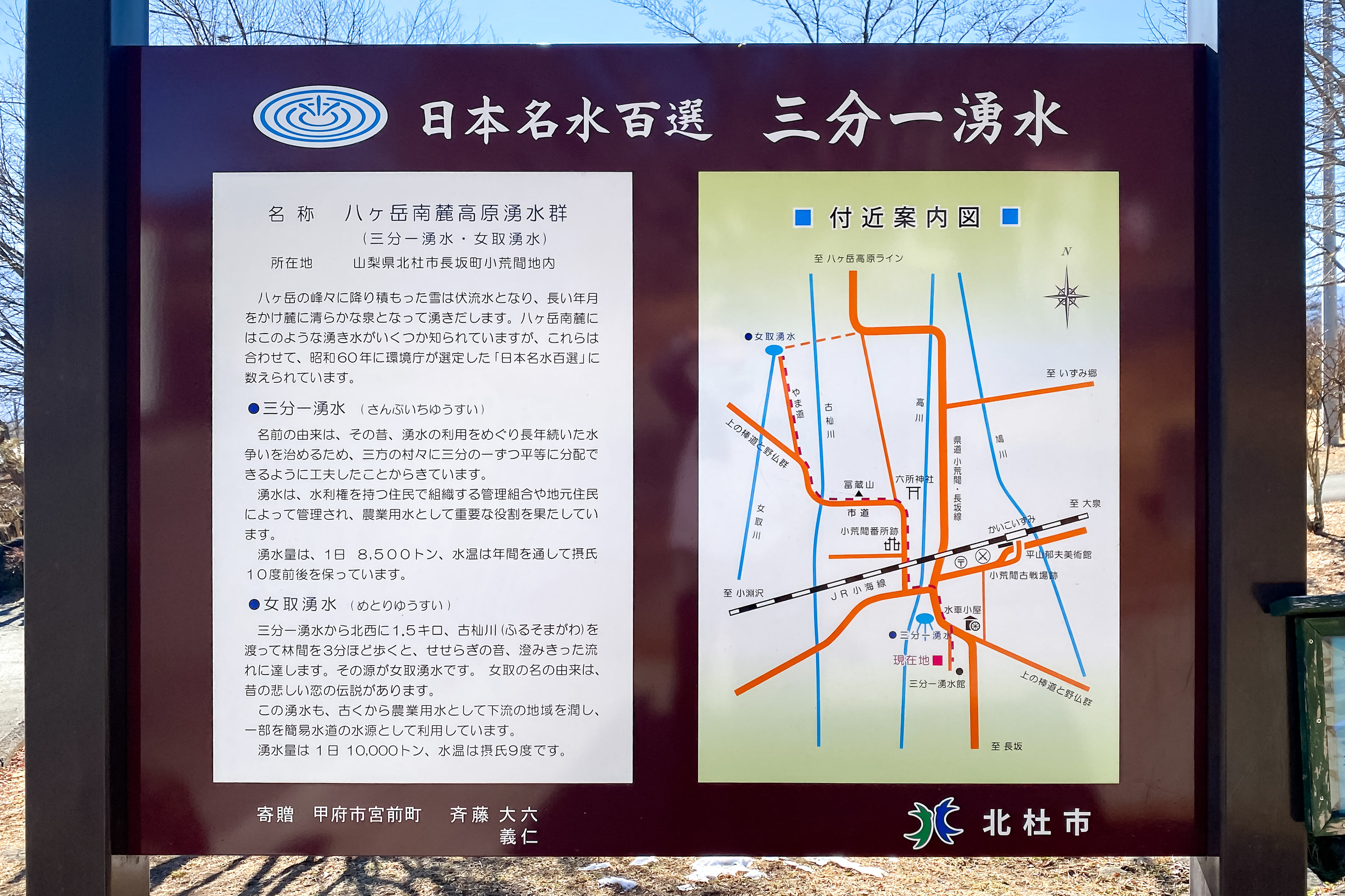 三分一湧水はちょっとした有名スポットらしくそれなりに大きな駐車場が完備され展望台やちょっとしたお土産コーナーも併設。展望台からは雄大な景色が満喫できこの時期は空気も澄んでいますから富士山をはじめ南アルプスそして八ヶ岳までパノラマビューを楽しめます。