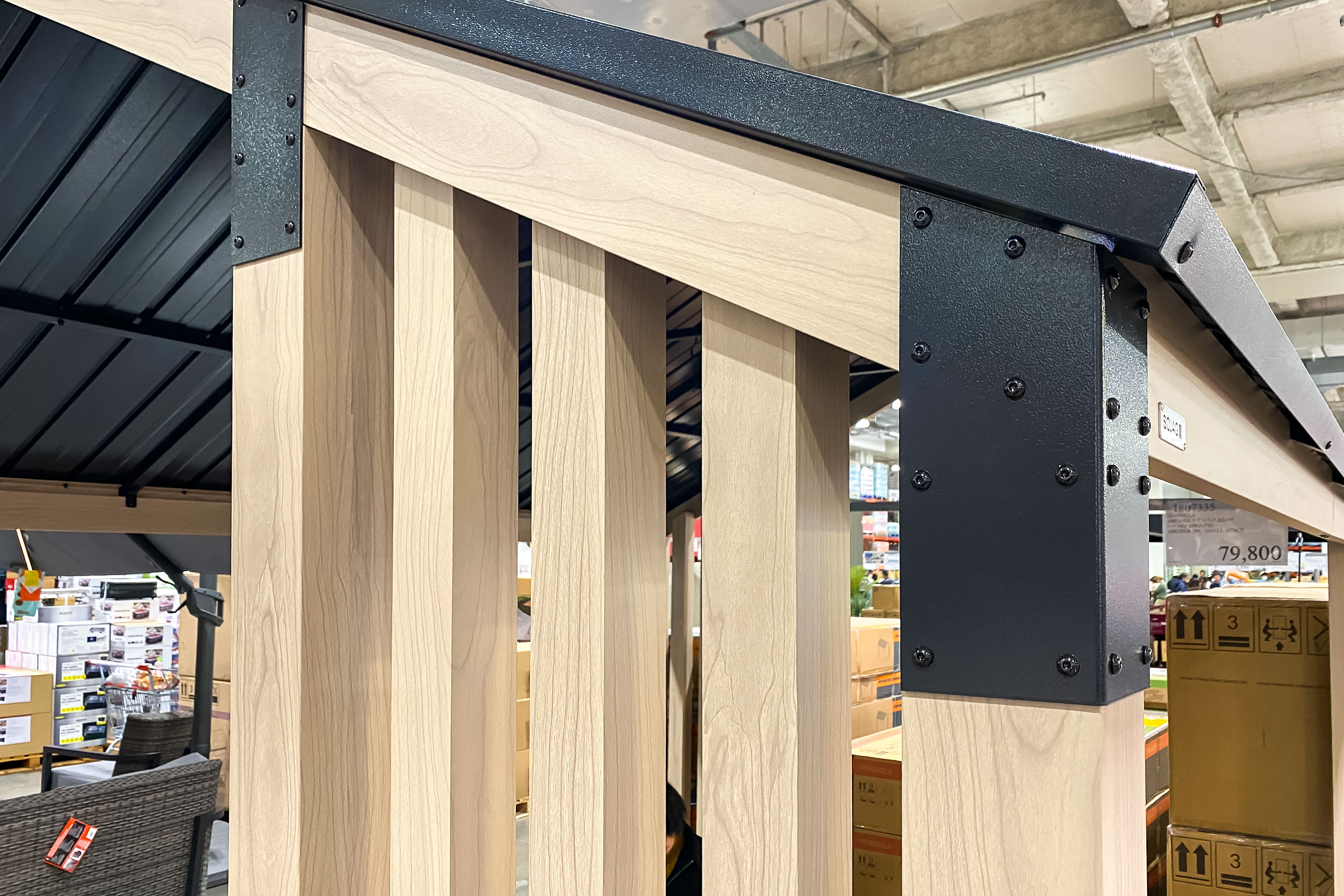柱などウッドに見える部分も実は金属製で木目で仕上げられていますからなんともモダンな雰囲気。軽そうに見えて130kgもあるそうなので一旦設置したら移動は現実的ではないですが、130kgといえど形状的に強風には弱そうですから設置の際は土間打ちは必須でしょうね。