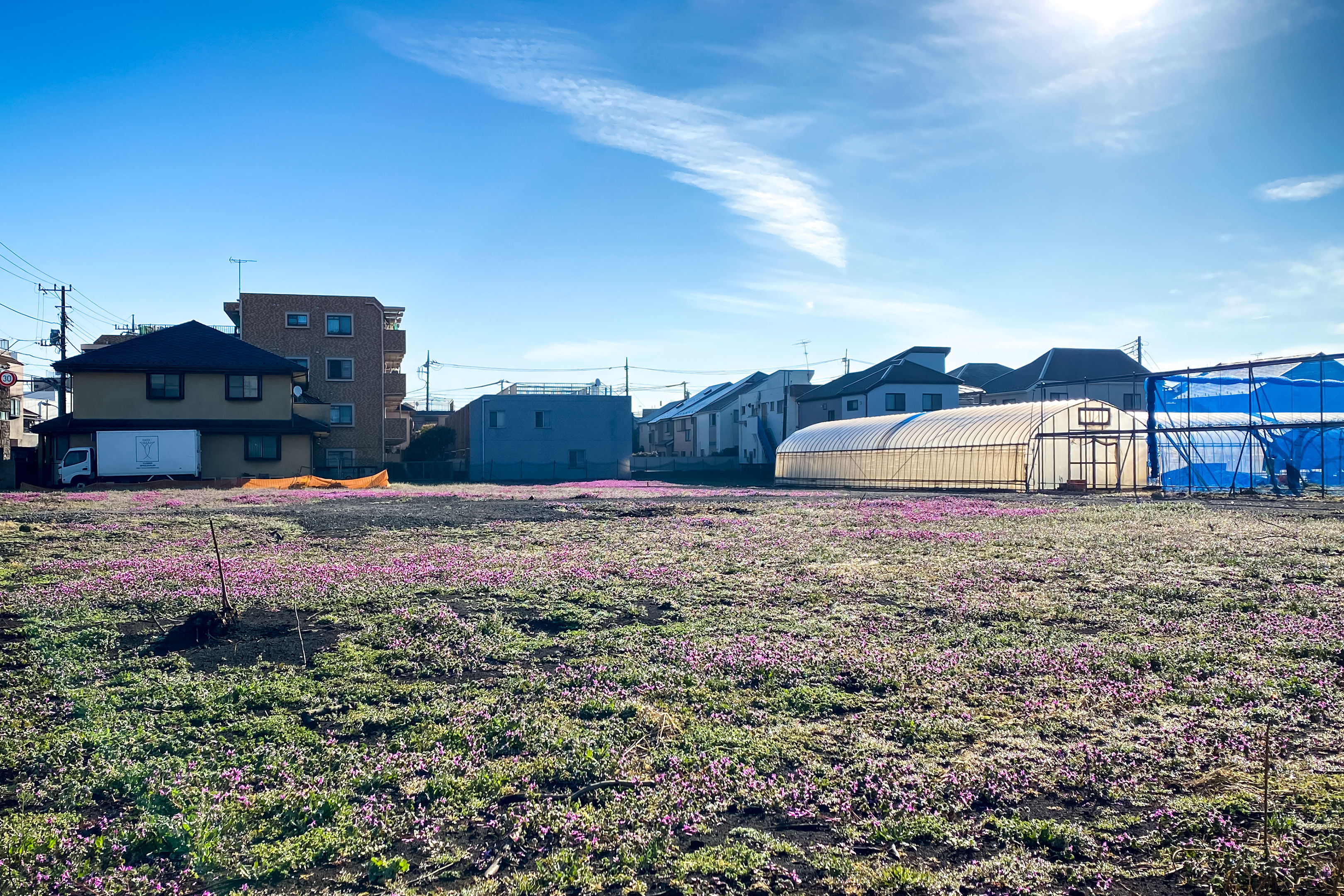 以前は果樹園だった場所がある日突然一切の樹木が伐採され今は広い空き地になっています。部分的に砂利が敷かれていたりするのでいずれ宅地となるのでしょう。 住宅が建てられるまでの僅かな期間、空き地といえど草花はその隙をついて伸び伸びと成長し、いつの間にか一面が紫色の花で覆われました。名も知らぬ花ですが寿命は長いようで、もう1ヶ月ほど変わらず咲き続けています。 時々見ていたこの光景に今日は夜露が被りいっそうキラキラして綺麗でした。