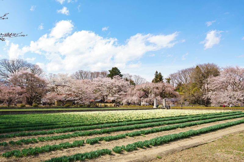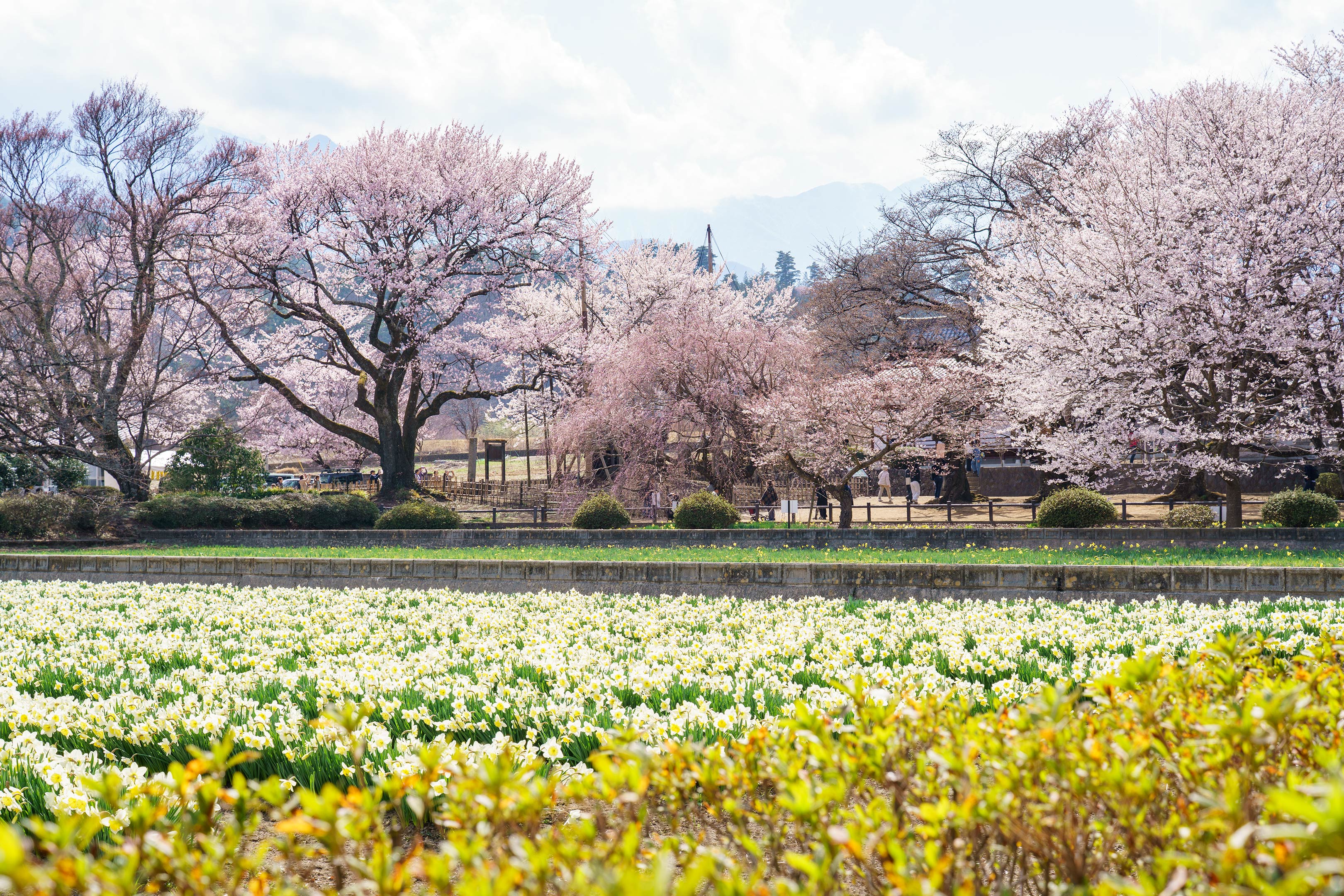入口へ続く道路からは既に見事な桜が視界に入りますが、手前に咲き始めたスイセンの黄色もまた美しく。