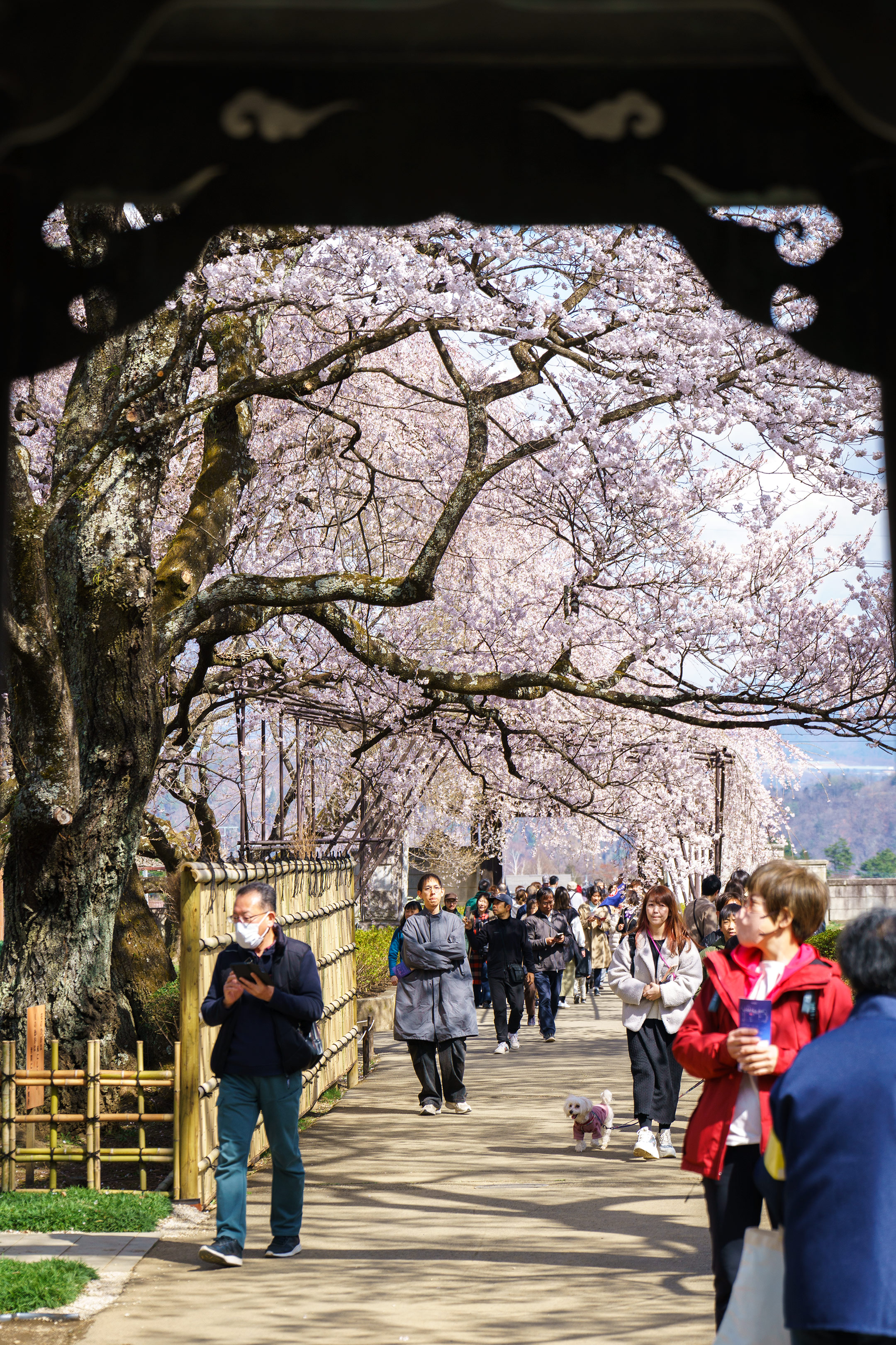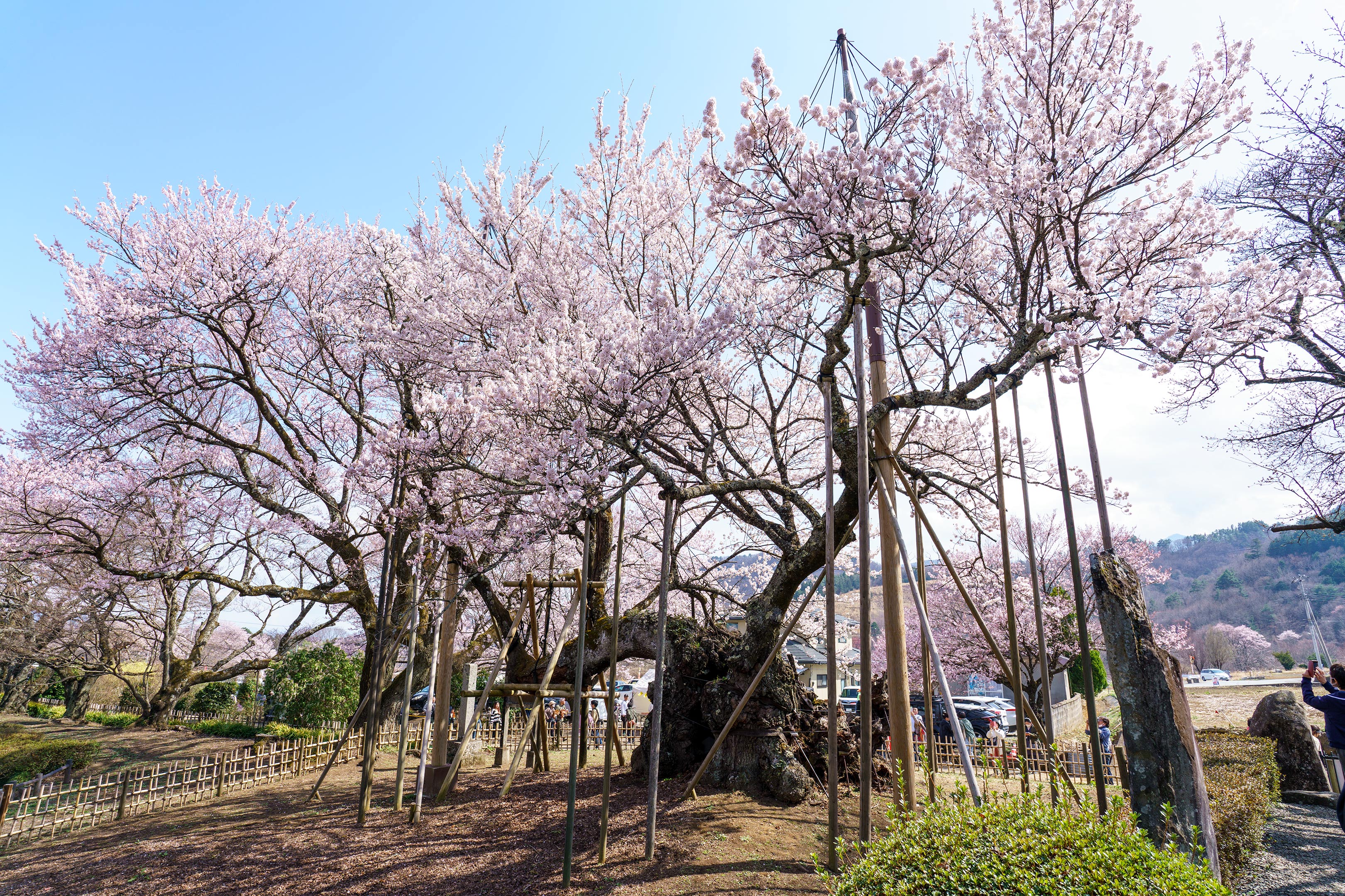 樹齢2,000年の名木を眺める人々を遠くから望む。穏やかな春が大変美しい山梨の週末でした。