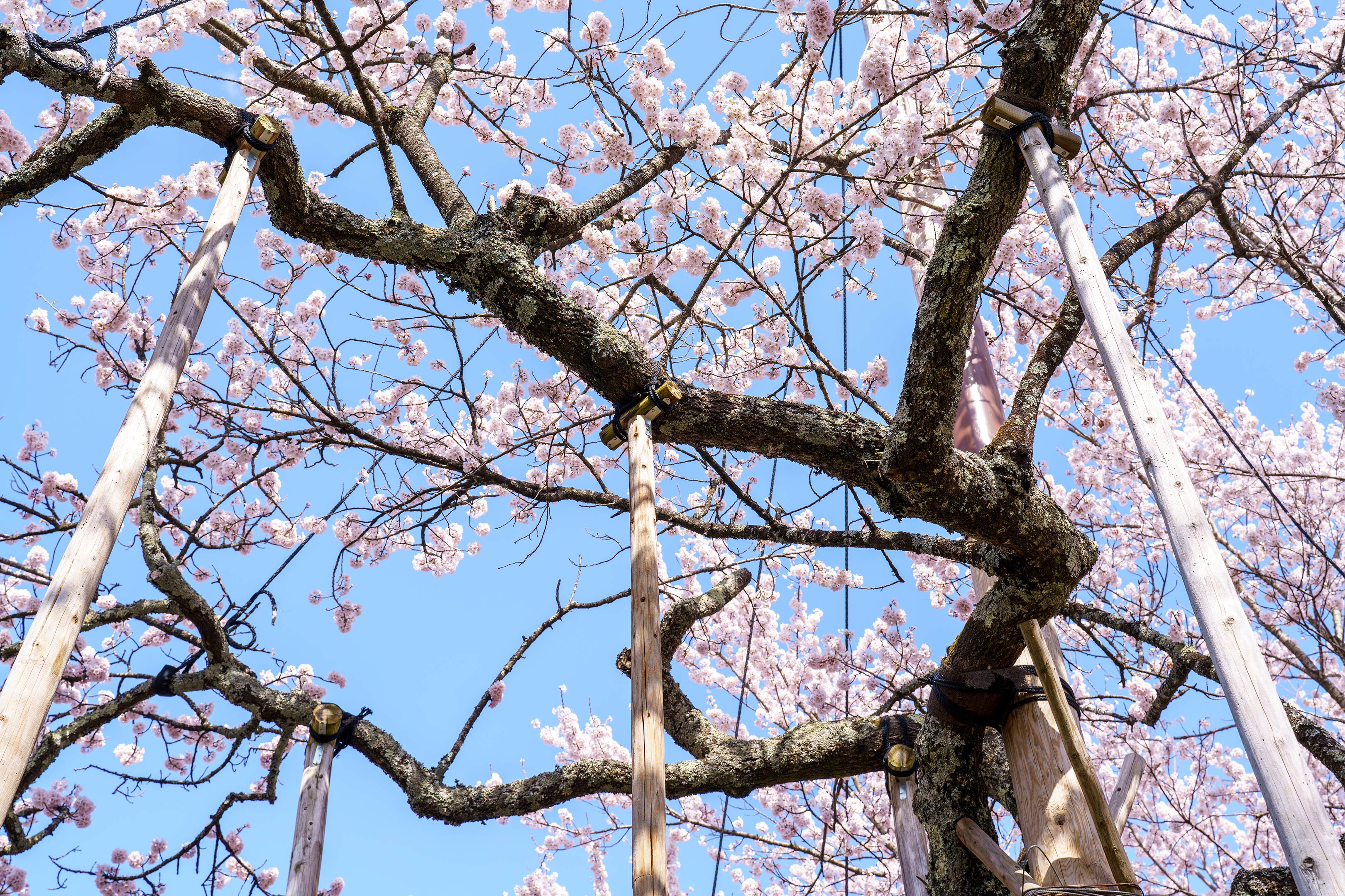 近くで見るとその答えが明らかになります。この桜は既に自立出来ないほど老朽化しているためこれらの棒によってあらゆる方向から支えられておりました。