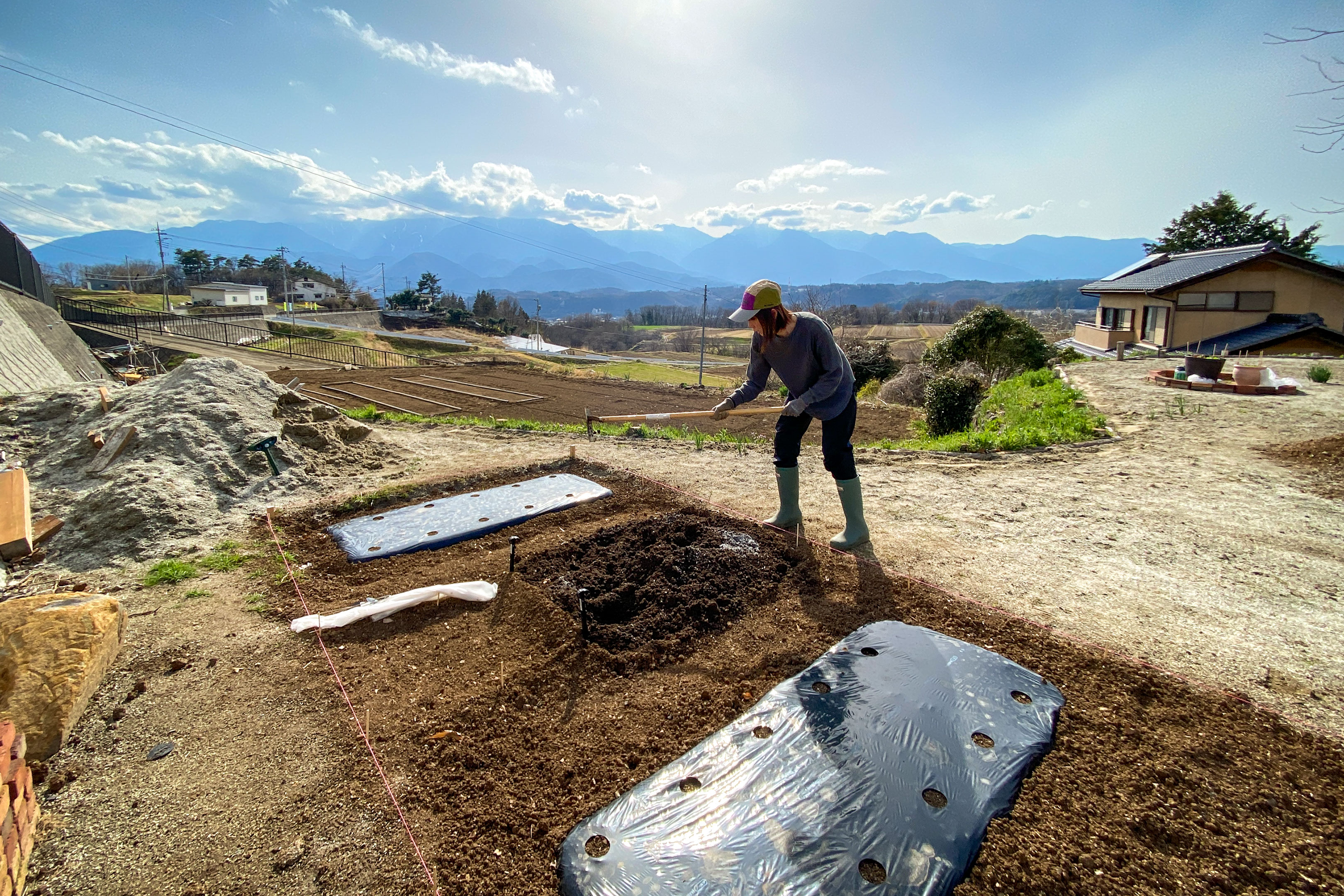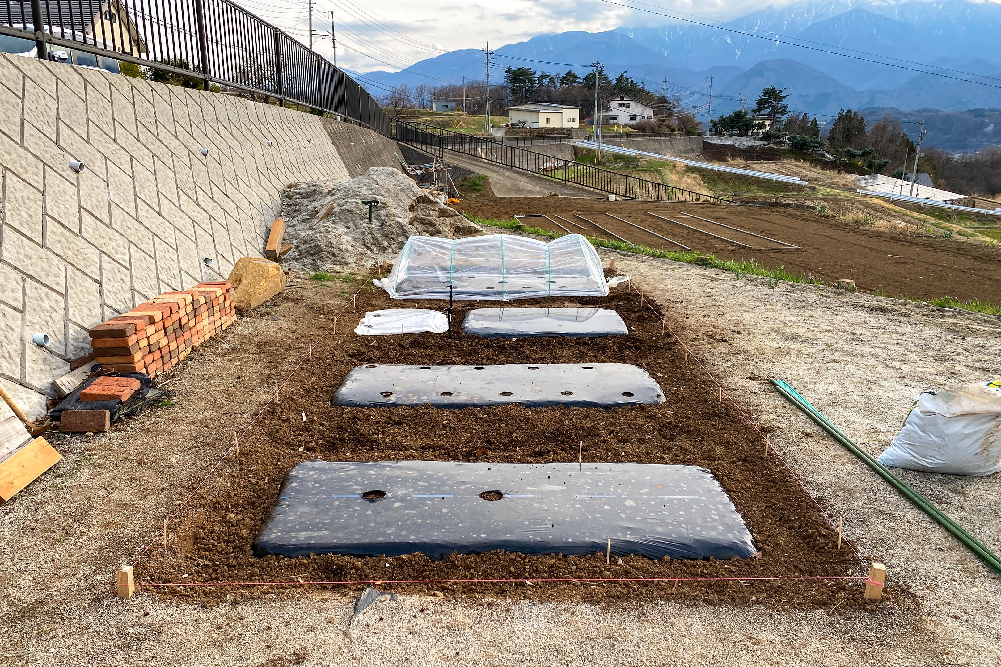 2m×5mの小さな菜園エリアに予定通り4つの畝とマルチ張りが終わったところ。
