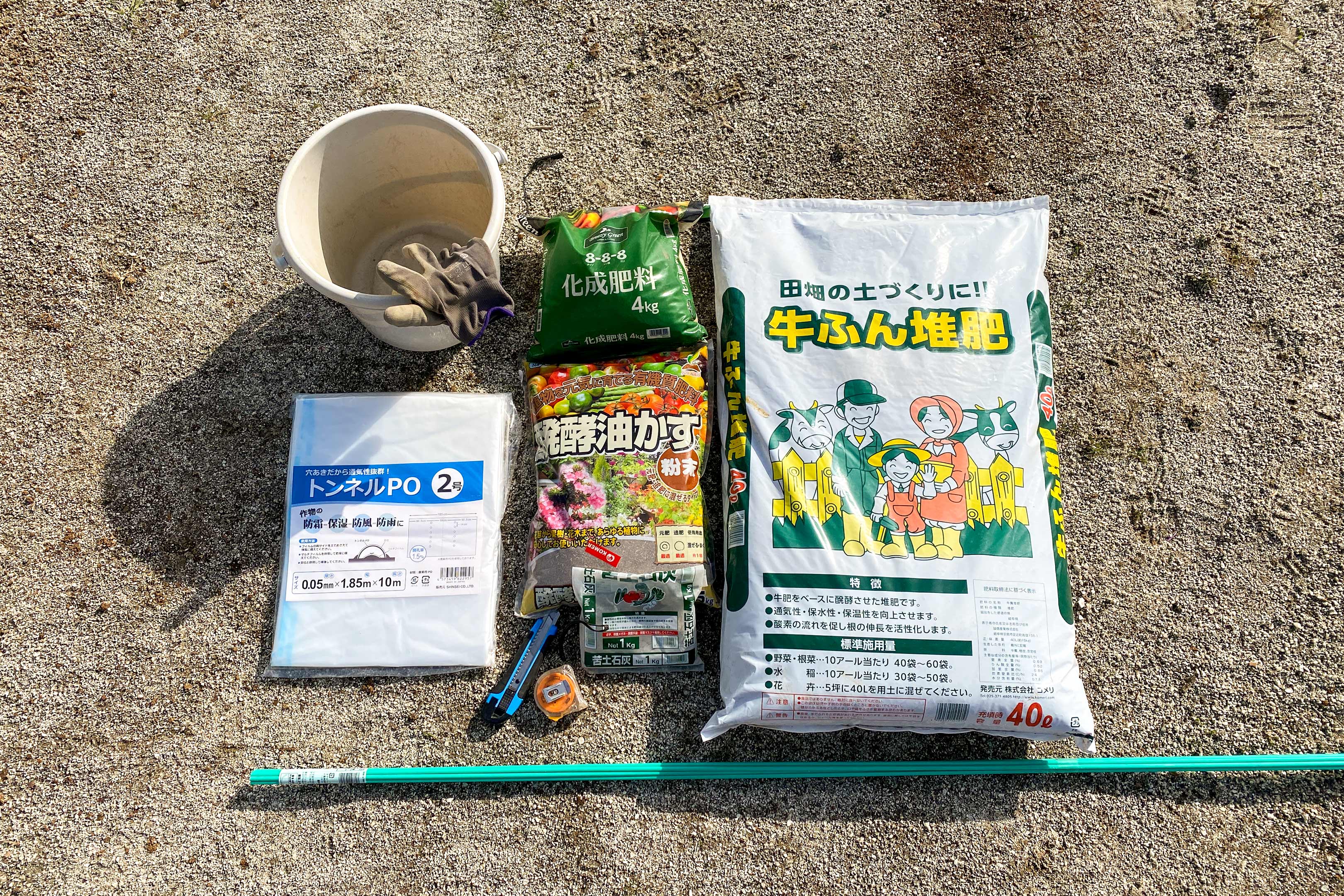 東京の農園ではこうしたビニールトンネルに園主が準備してくれていたユーラックなる資材を使っていたのですが、いざ個人でそれを購入しようと思うと100メートル単位でしか販売されておらず値段もかなり高いので、我が家ではユーラックで採用されているのと同じPOフィルム製トンネルを10m購入しておきました。