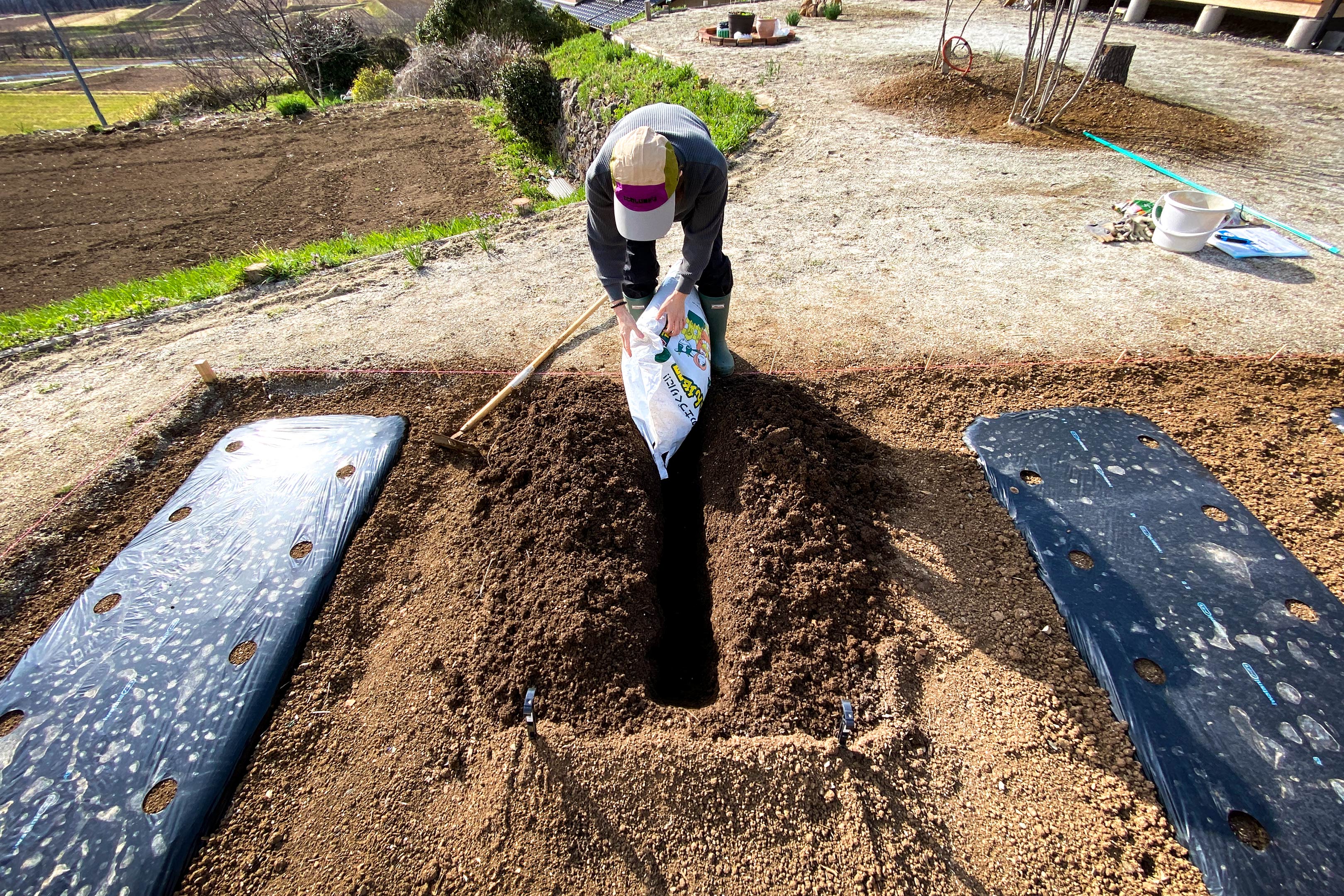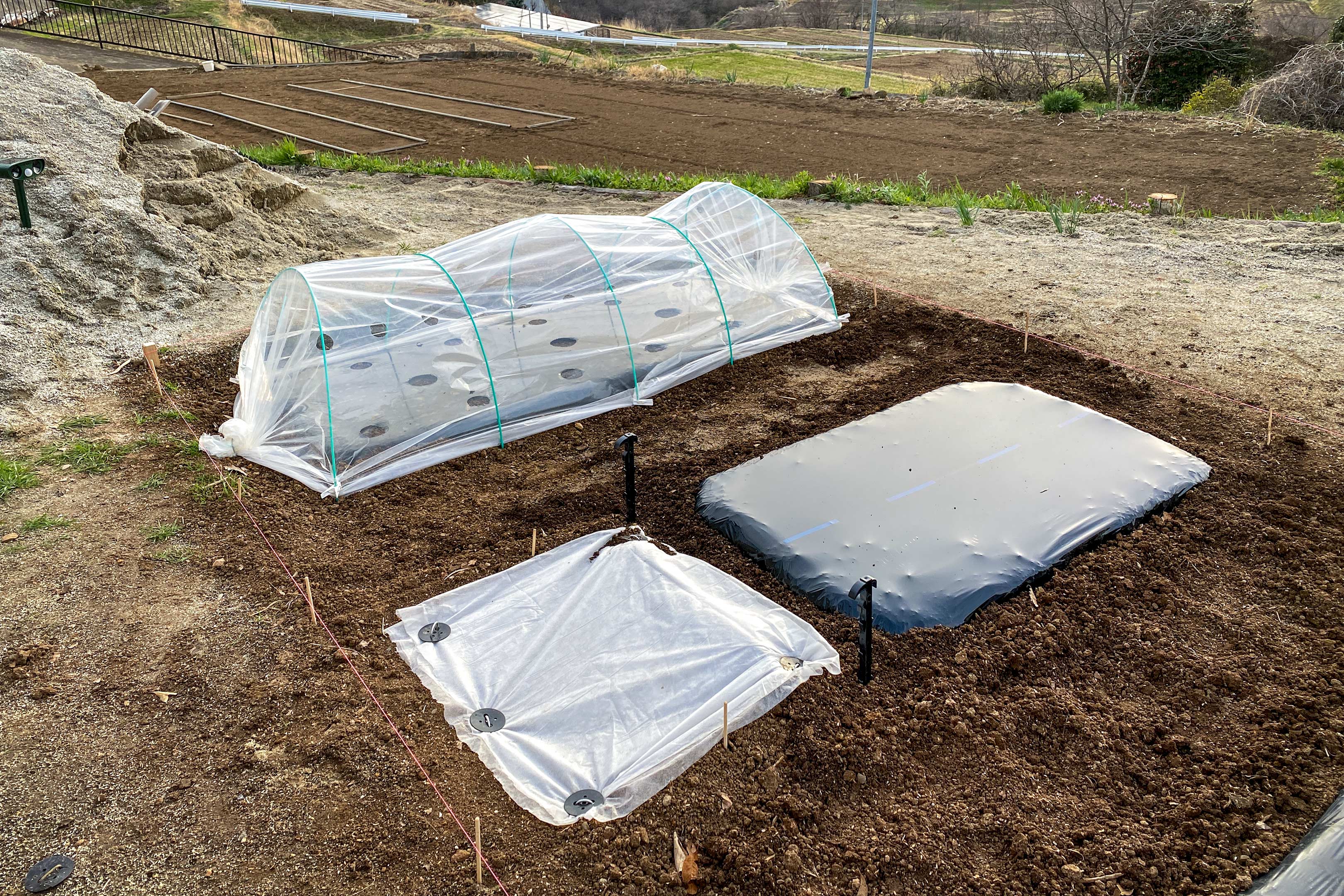 一番奥のトンネルが早蒔きを終えたエダマメ、奥から2列目が定植を終えたジャガイモとこの日準備を終えたナス・シシトウ、一番手前がサトイモと1ヶ月後に種まき予定の落花生。手前から2番目の畝が再来週(4月中旬)種蒔きを予定しているトウモロコシ。