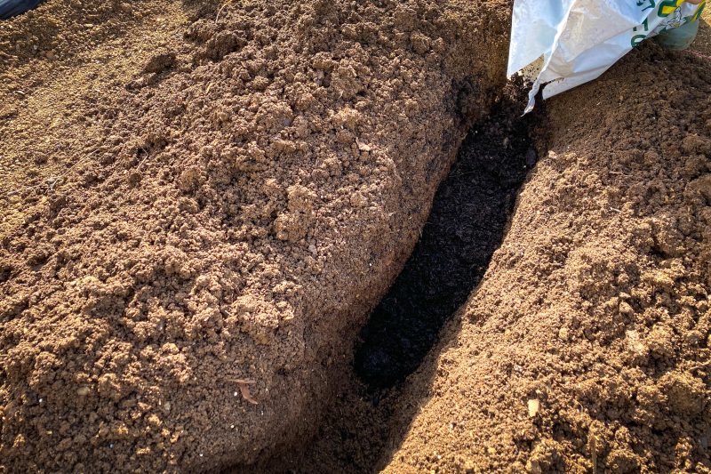 深さ40cmの溝を掘りそこへ牛糞堆肥と油カスを入れているところ。自宅にはバーク堆肥もストックしてありそちらであれば封が開けてあったので新品の牛糞堆肥を開封するのには少々躊躇いがあったのですが、有機肥料の意味合いも兼ねるという理由から少しでも栄養素の高い牛糞堆肥を使用することにしました。