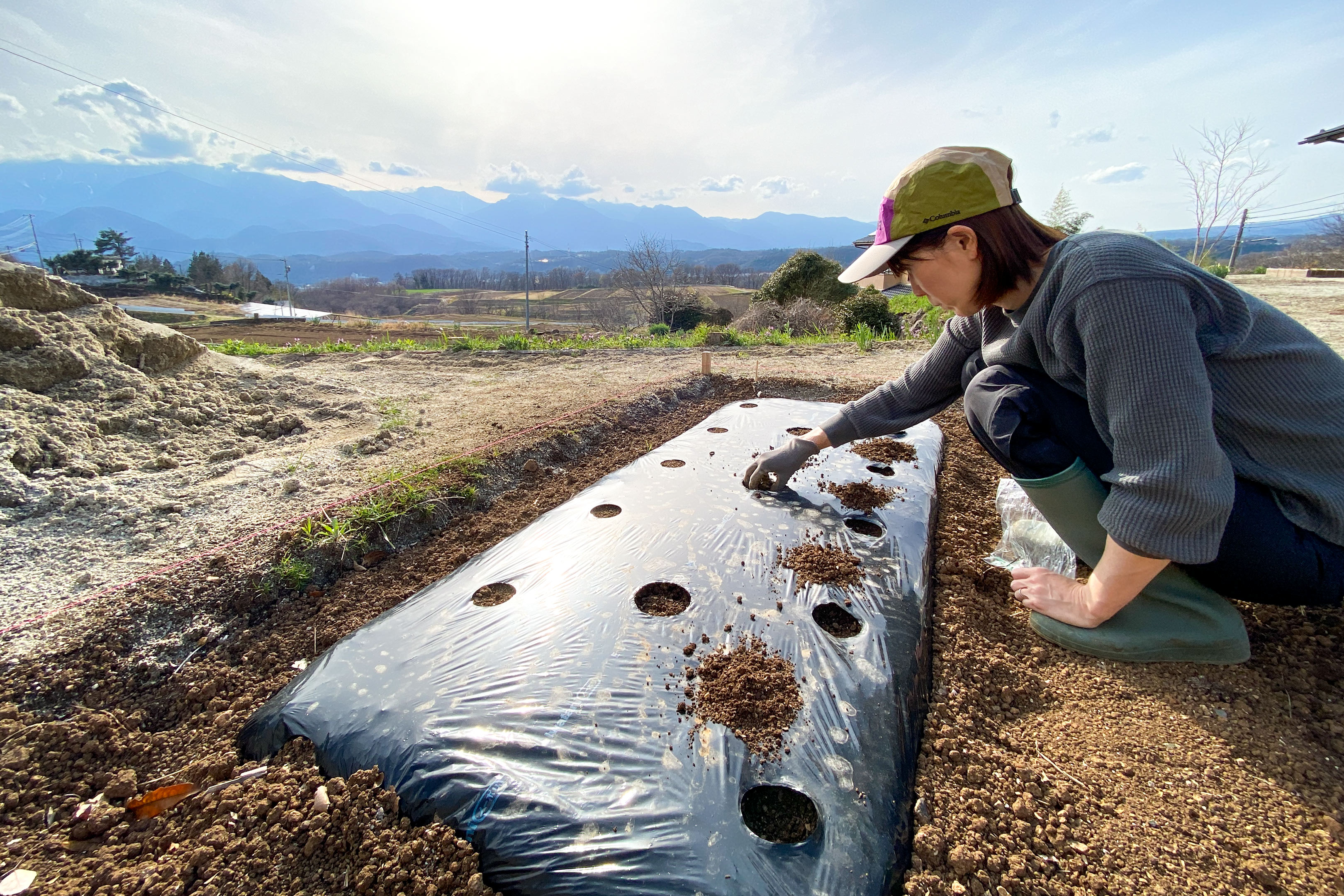 エダマメの畝にはビニールトンネルを被せました。この時期はまだ気温が低いため安定した温度確保の目的とカラスなどの鳥から種を狙われないよう鳥よけの意味合いがあります。