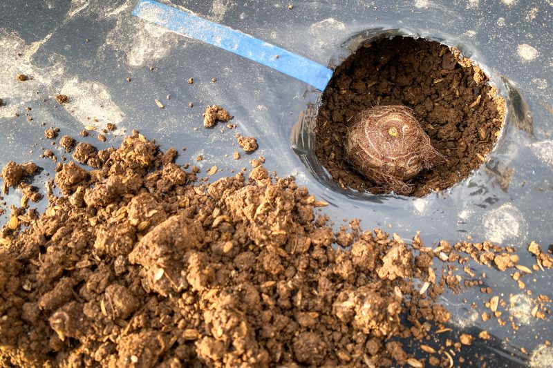 マルチに開けた2箇所の穴にそれぞれサトイモの種芋を植えます。サトイモって一回作ればその年収穫した芋をまた来年の種芋として使えると言われていますから、上手くすれば今年購入したこの種芋が一生分の芋に化けるのかも?