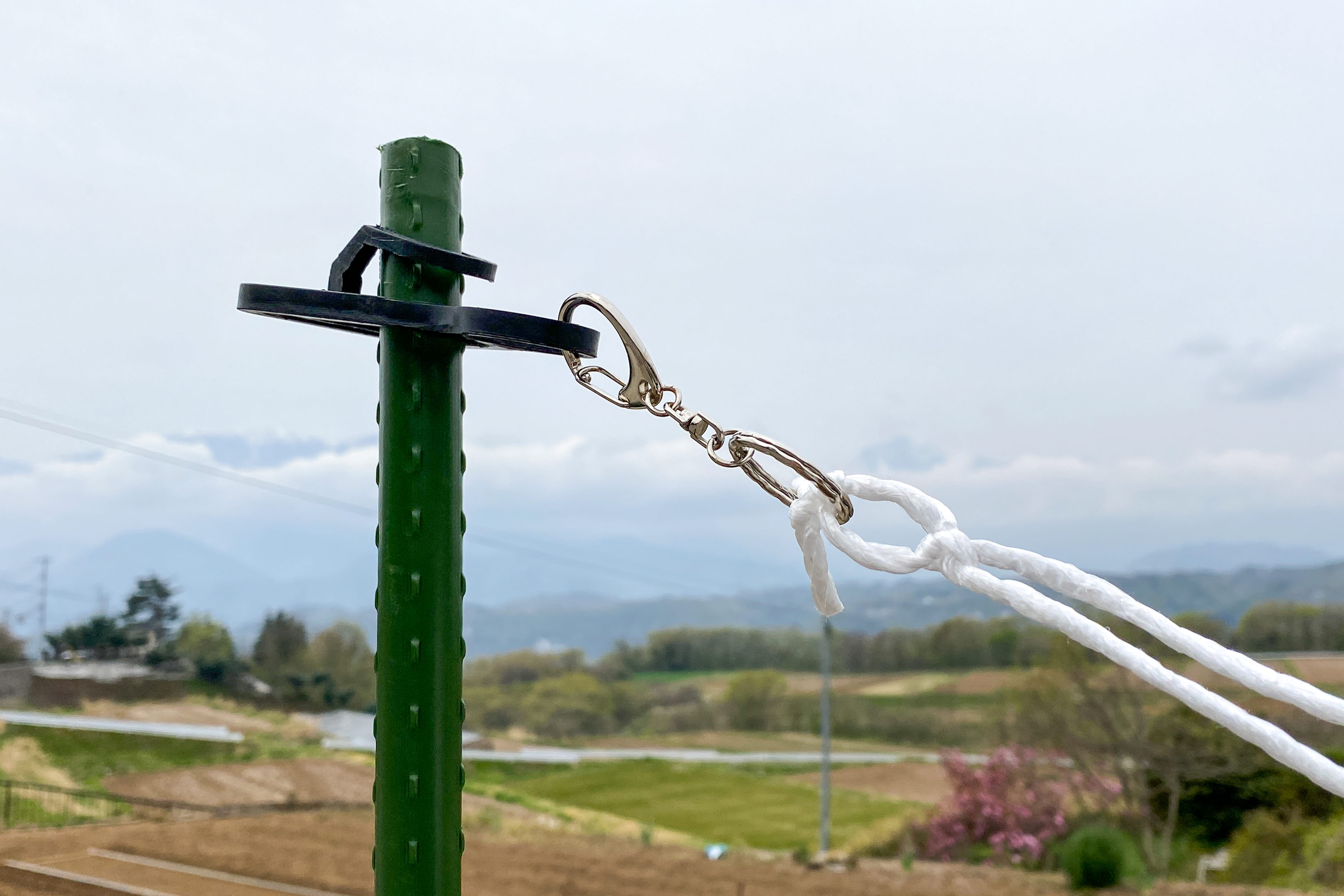 YouTubeの情報によればこの目玉風船が風に吹かれるとぐるぐると回転してしまい固定している糸がよじれてしまったり切れて飛んでいってしまったりするらしいので、我が家では支柱の根本付近にヨリ戻し金具を組み合わせて装着してみました。