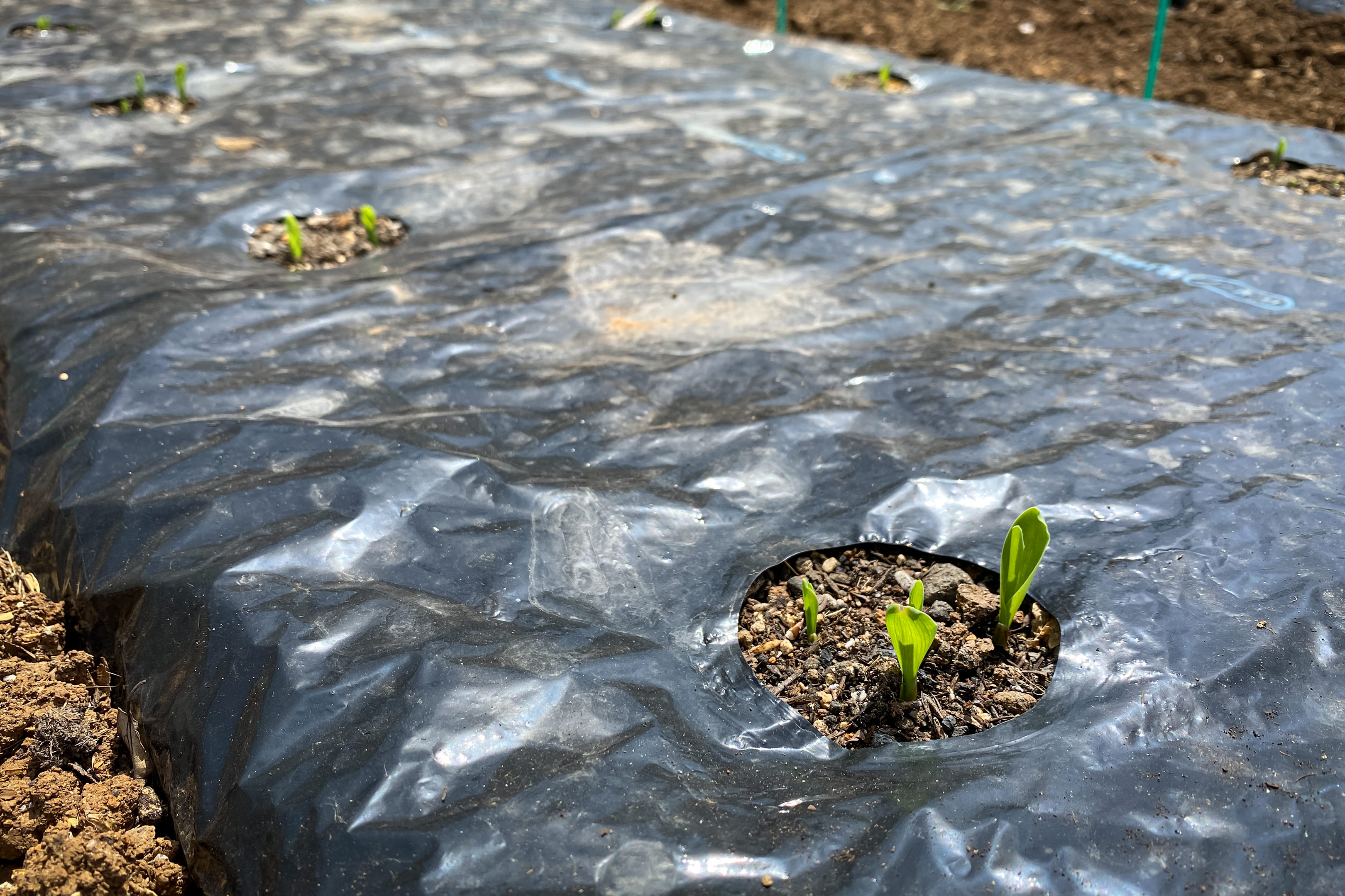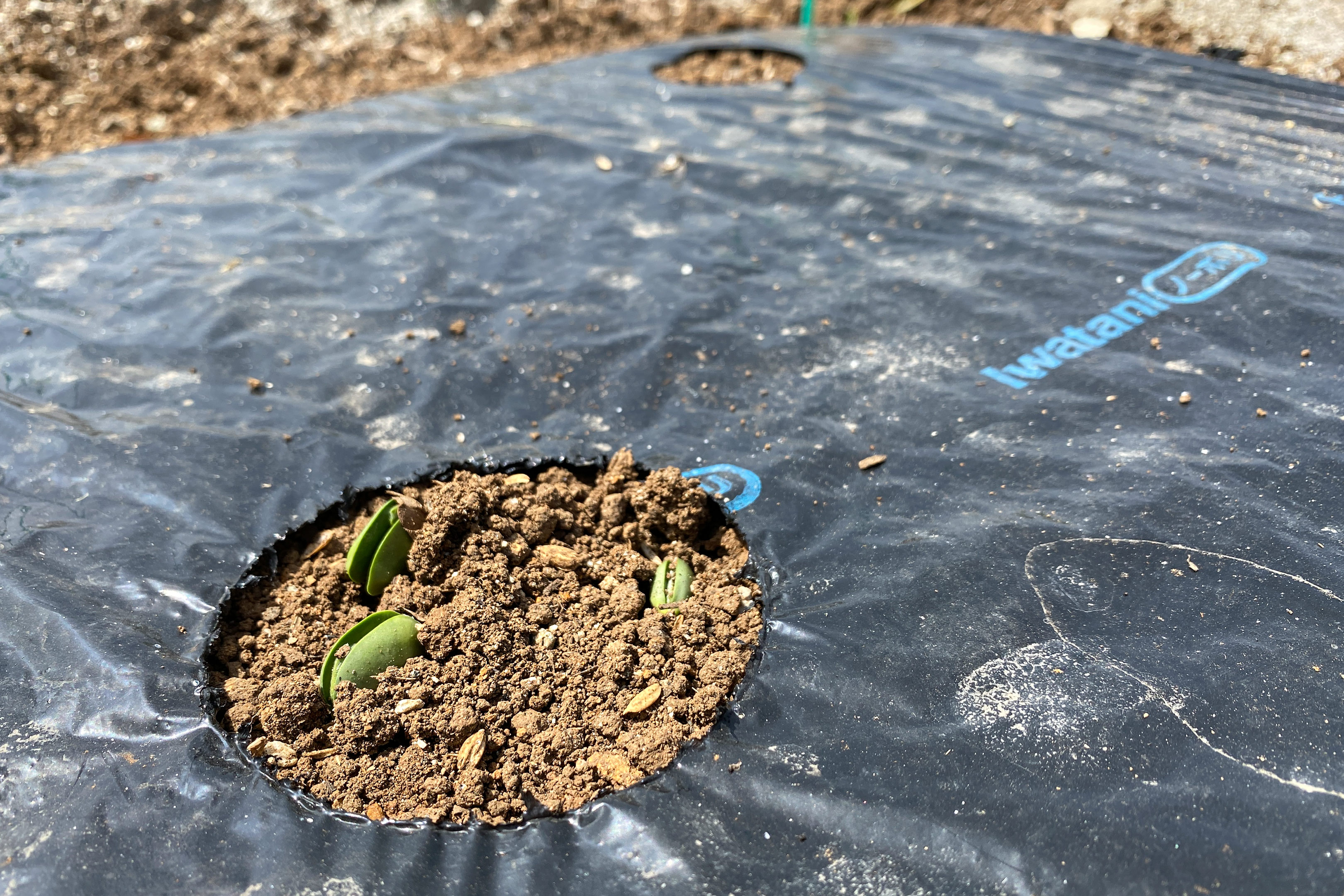 こちらは1週間前に蒔いたトウモロコシ。1穴3粒蒔きとしましたがほぼ全ての穴が問題なく順調に発芽しており、1日経過でも目に見えるほど元気に成長しています。種蒔き用に穴の周辺のみ市販の培養土を使っているのが功を奏したのかもしれません。
