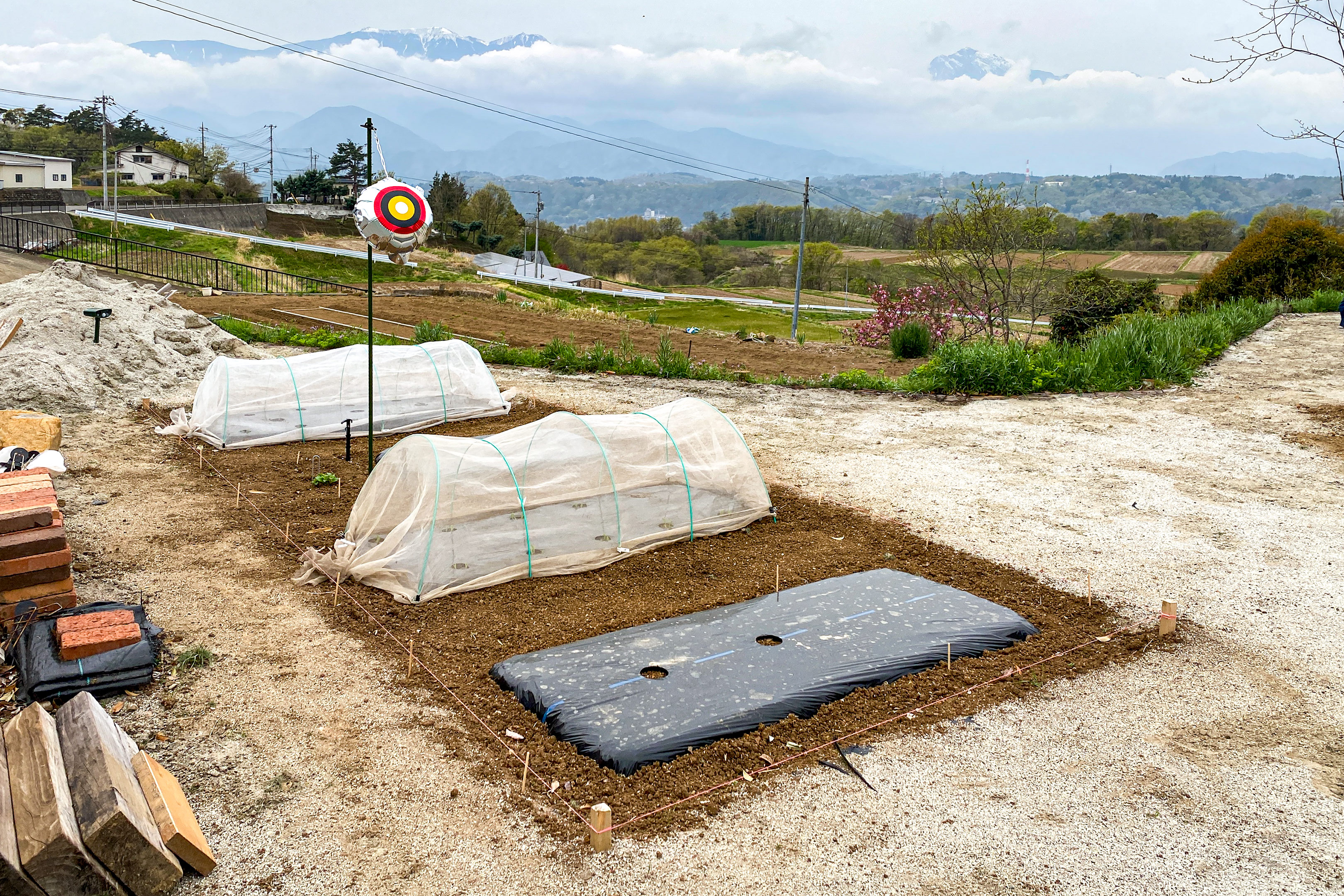 全体的に発芽したとはいえまだまだその芽は小さいもの。こうして2,3歩引いて見ると相変わらず殺風景な菜園にしか見えません。あと2週間もすればそれぞれの苗も成長し緑が生えて夏野菜の畑っぽくなるでしょう。