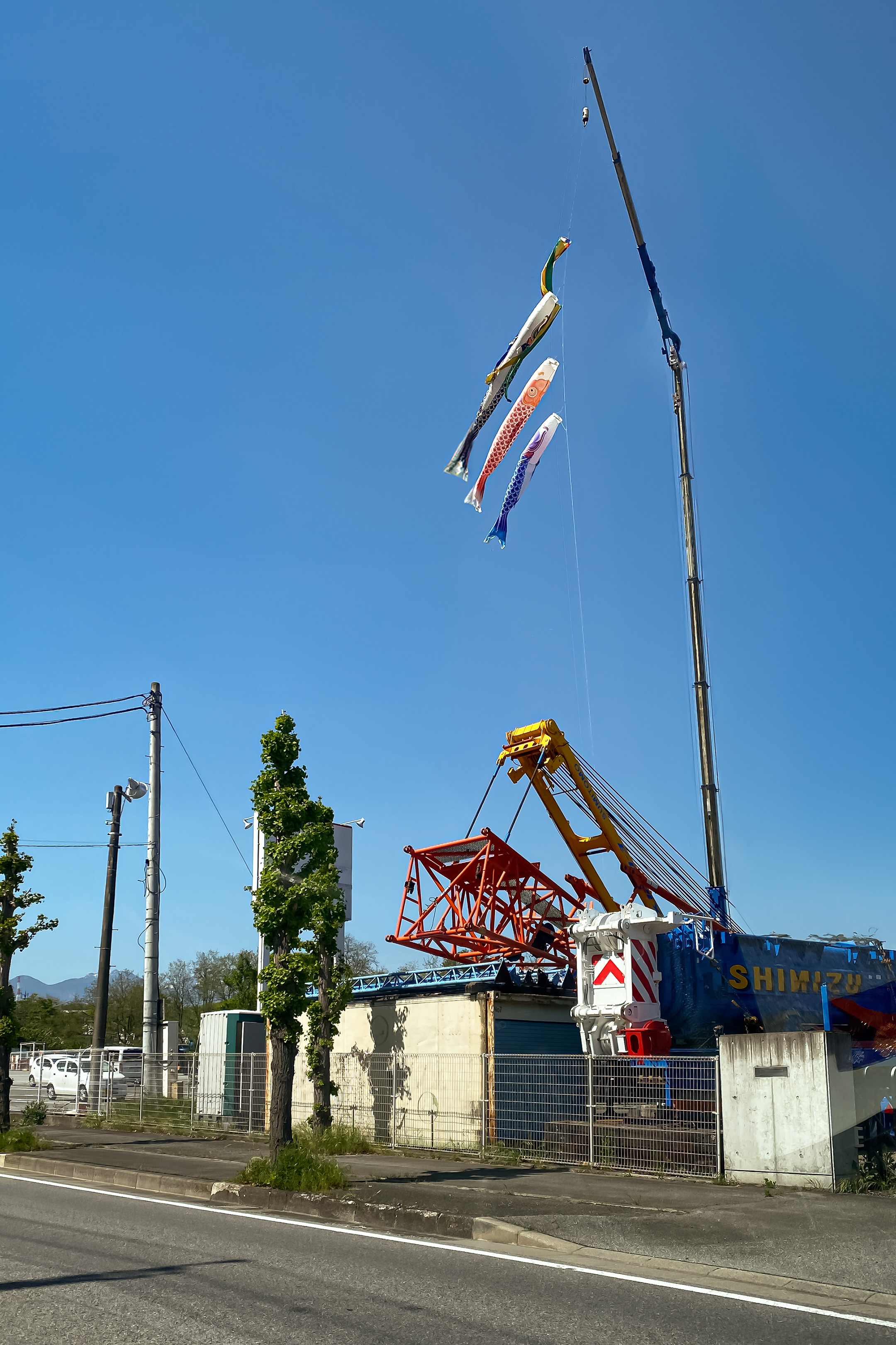 車で走っていたら少し遠くの方に鯉のぼりらしきシルエットが見えました。ただそれにしては随分高い位置に...。進行方向に近づいてきてその理由が明らかになりました。大型クレーンをめいいっぱい伸ばしかなり高い位置に巨大な鯉のぼりをぶら下げていたのです。建築業者による粋な計らいというわけですね。