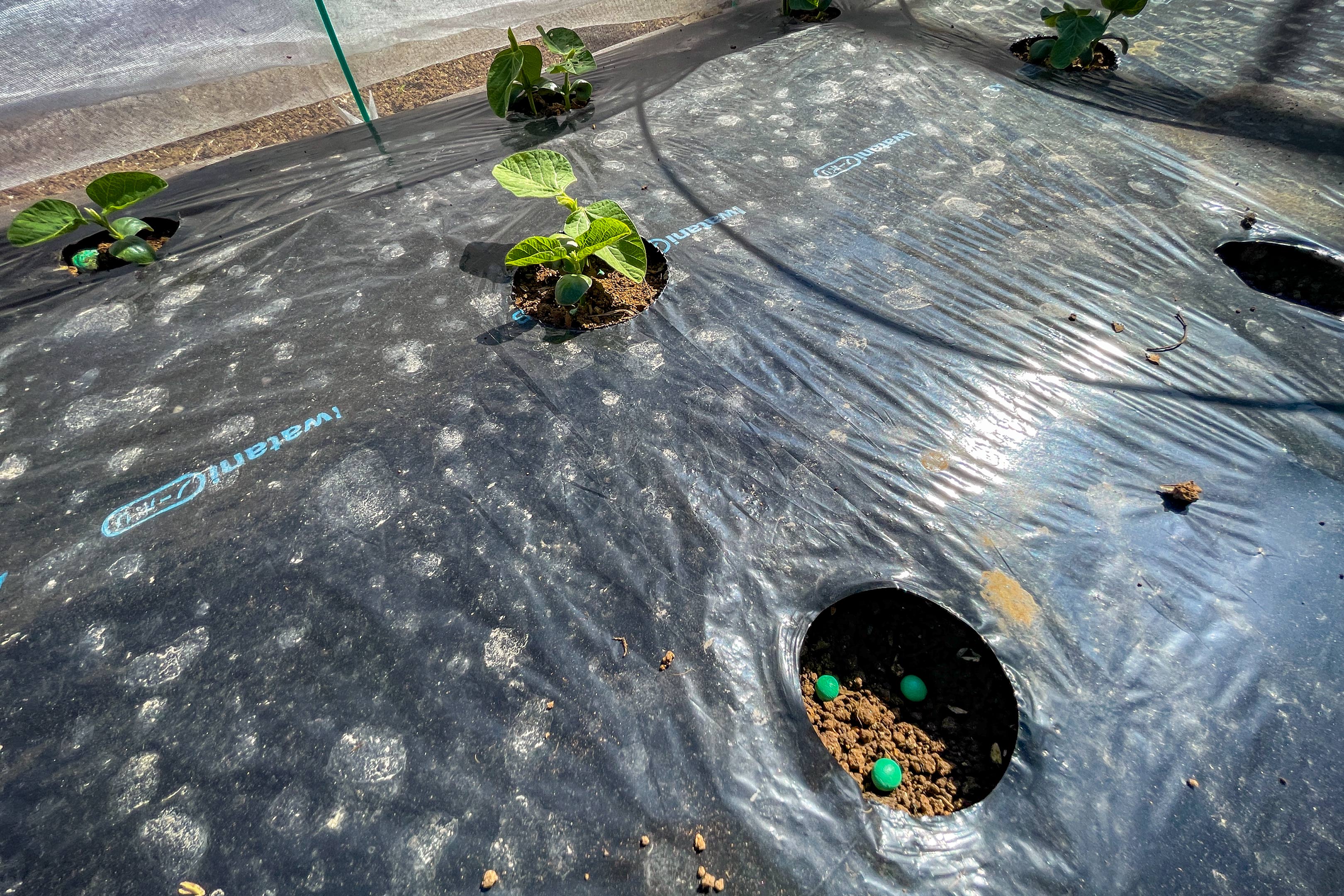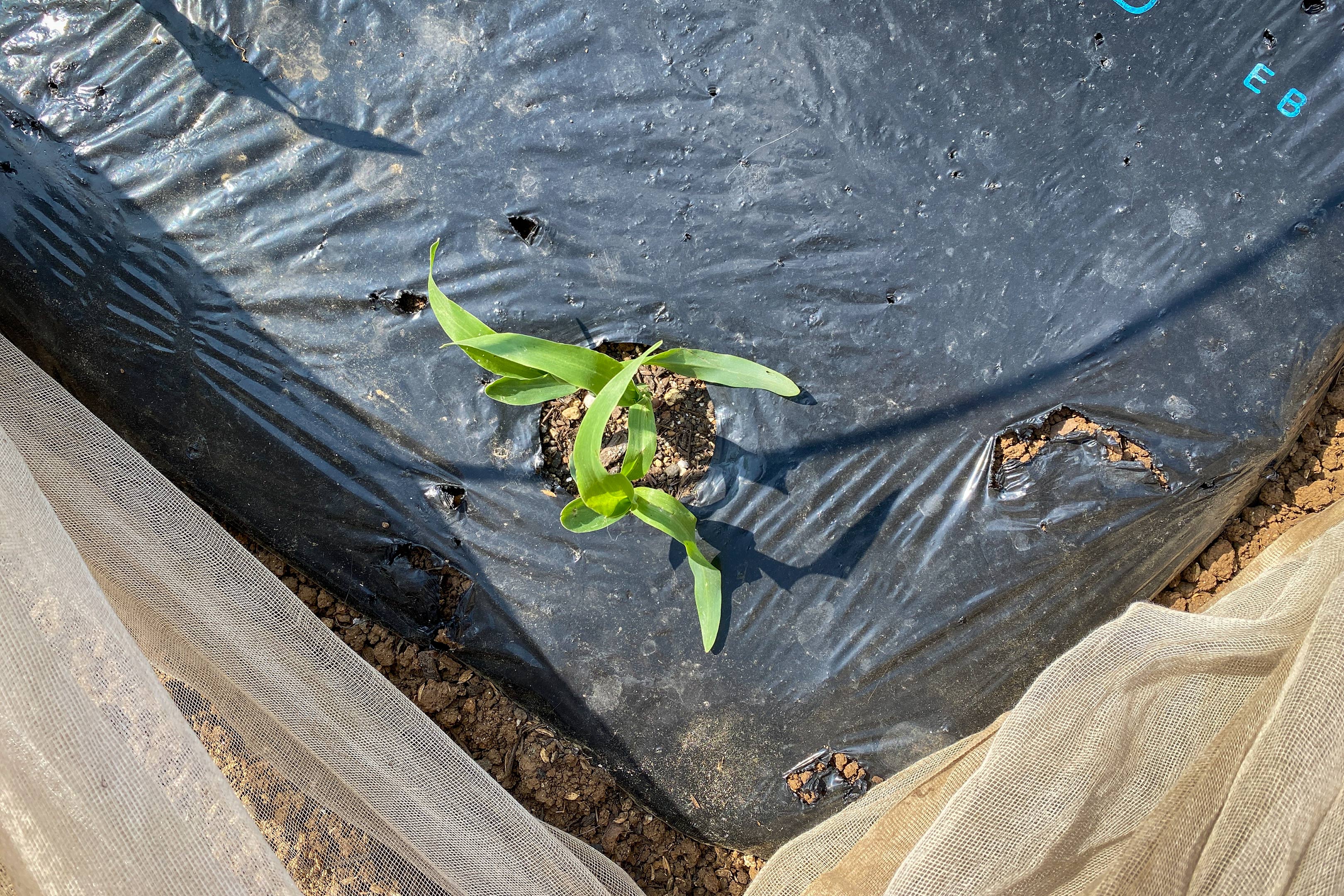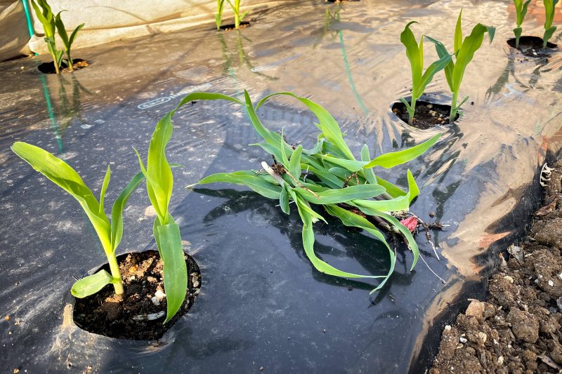 こちらはトウモロコシの畝。変なサイズ感で写真を撮っているのには意味があり、どうでしょう、上のマルチがやたら傷だらけで破けている事にお気づきでしょうか。