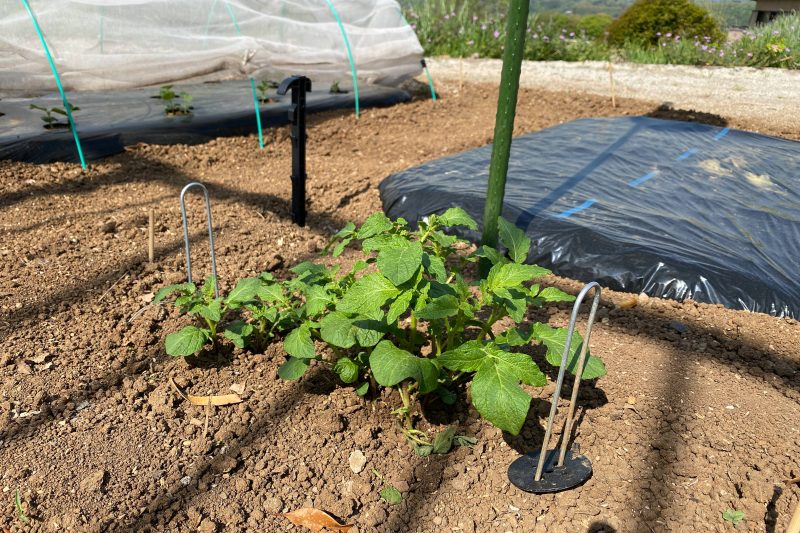 こちらはジャガイモエリア。2つの種芋を植え、両者には随分大きさの違いはあれど無事に顔を出してくれました。種芋の段階で十分な芽出しが出来ていなかったため発芽が心配されましたがまずここまでは成功という感じです。