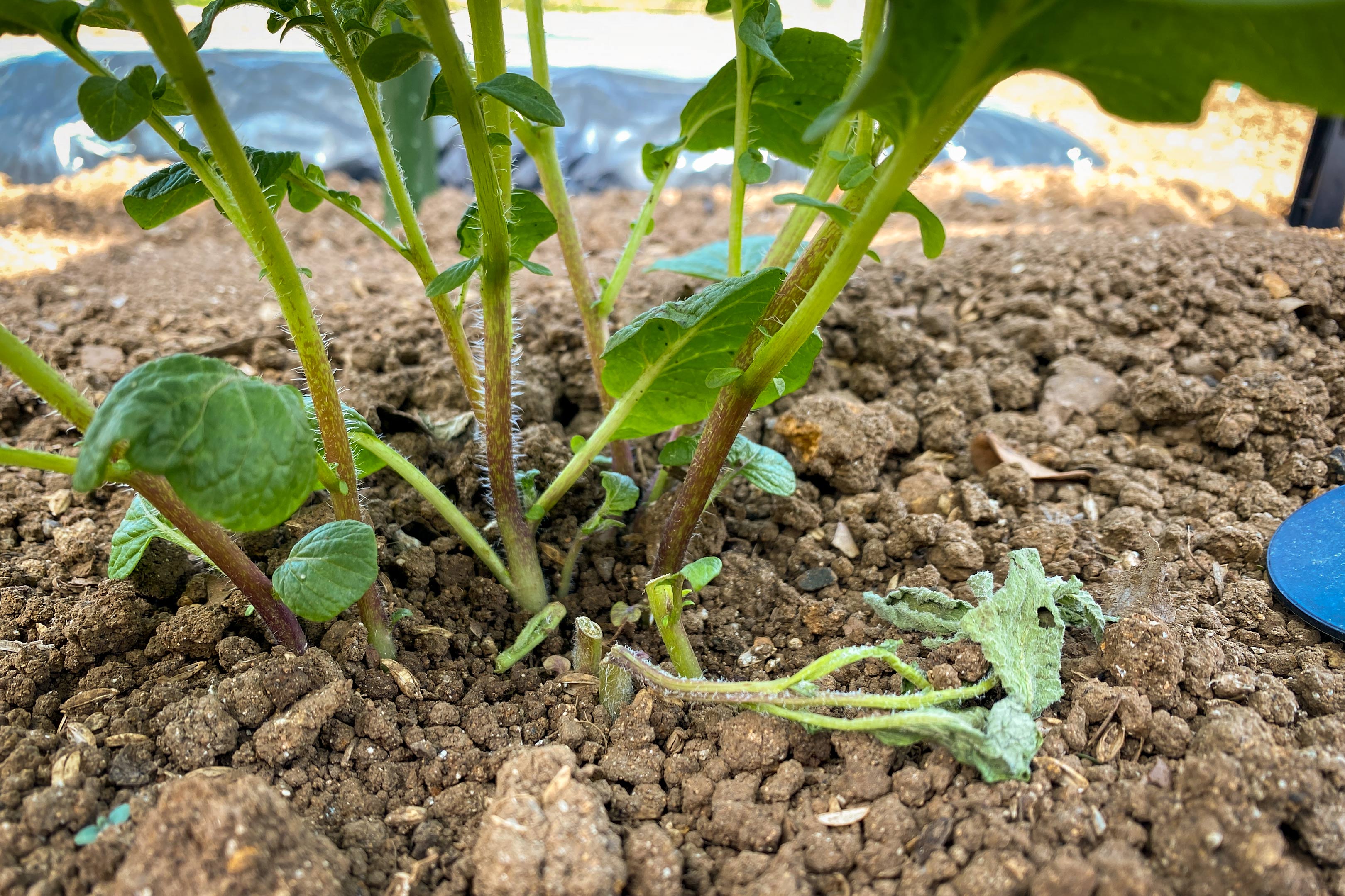 ただちょっと気になるのは手前のジャガイモの生え際を見ると何やら萎れた葉が見て取れます。一体これは何か?