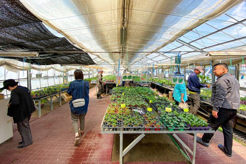 ハウスの中は様々な野菜の苗が星の数ほど並んでいます。これでもこのハウスは販売専用エリアで、実際に苗を作っているのは離れた場所にある専用ハウスらしいのでその総数は途方もない数です。