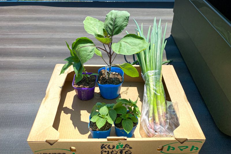 今回購入したもの。ナス(筑陽)、シシトウ(伏見甘長とうがらし)、大葉、赤ネギ。赤ネギはナスのコンパニオンプランツとして購入しましたが、ちょっと大きすぎるのでこの後細ネギを別途購入。